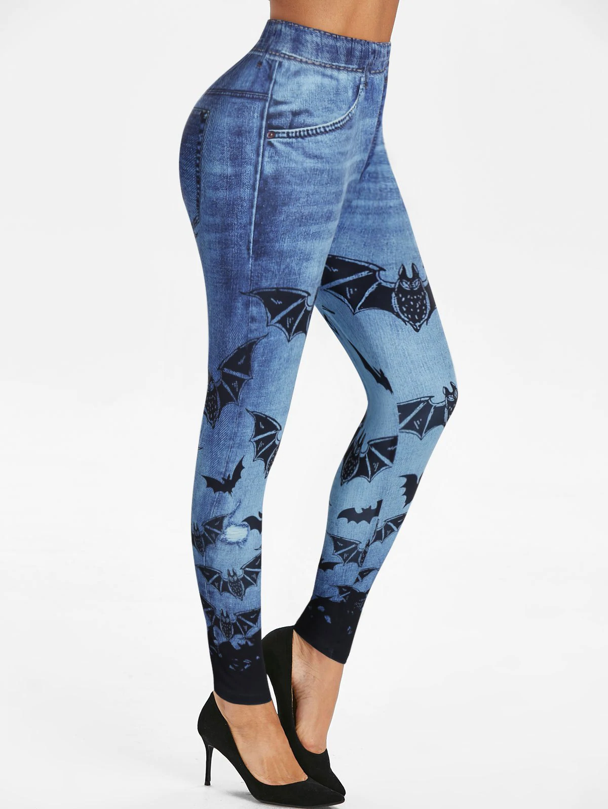 Bat Print Elastic Waist Skinny Faux Jean Leggings