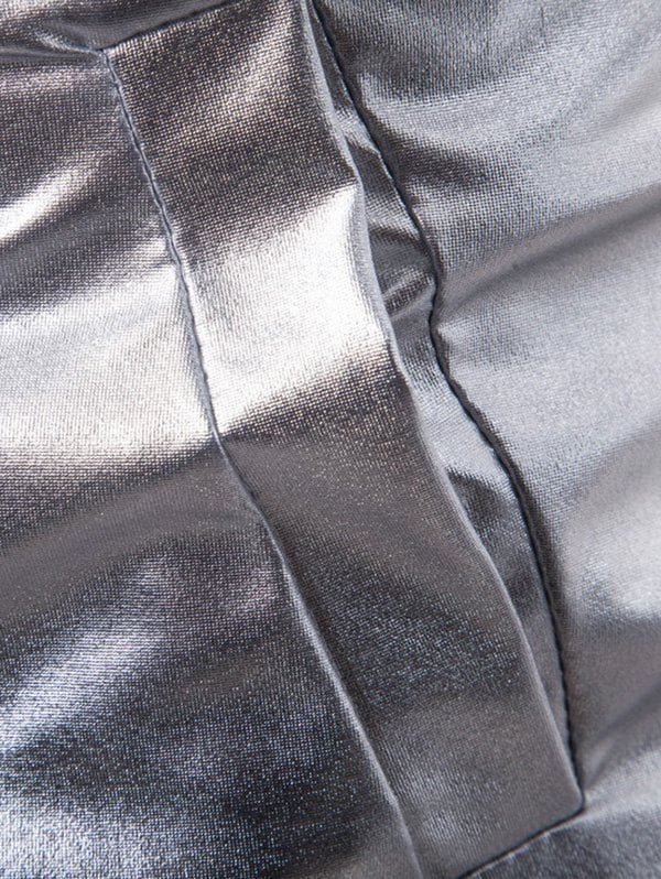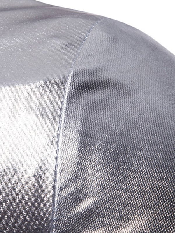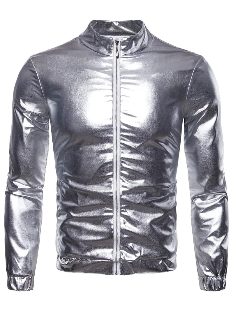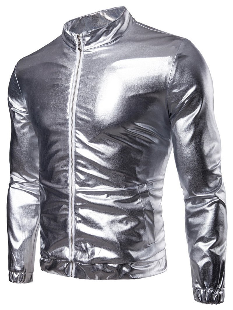 Shiny Jacket with long sleeve featuring stand collar, zip up fastening, two side pockets and elastic cuffs.
