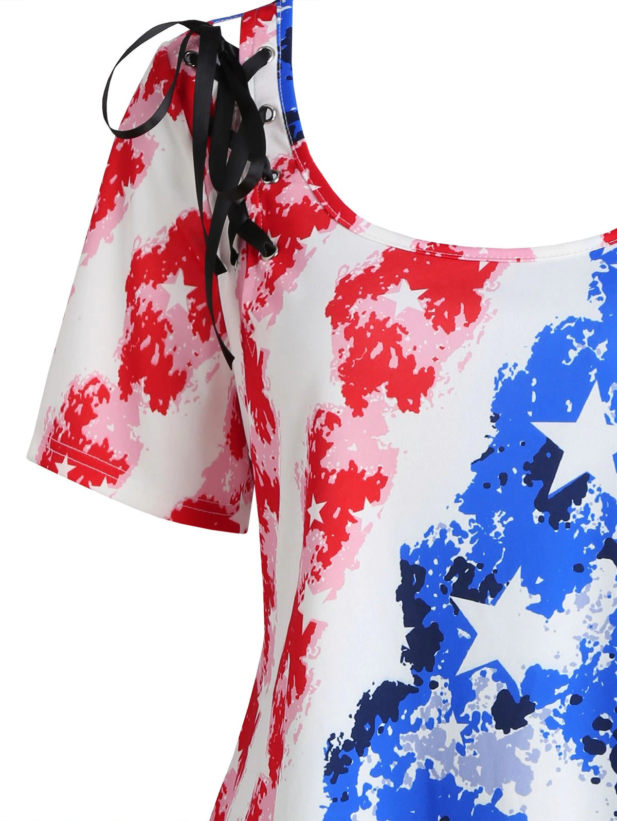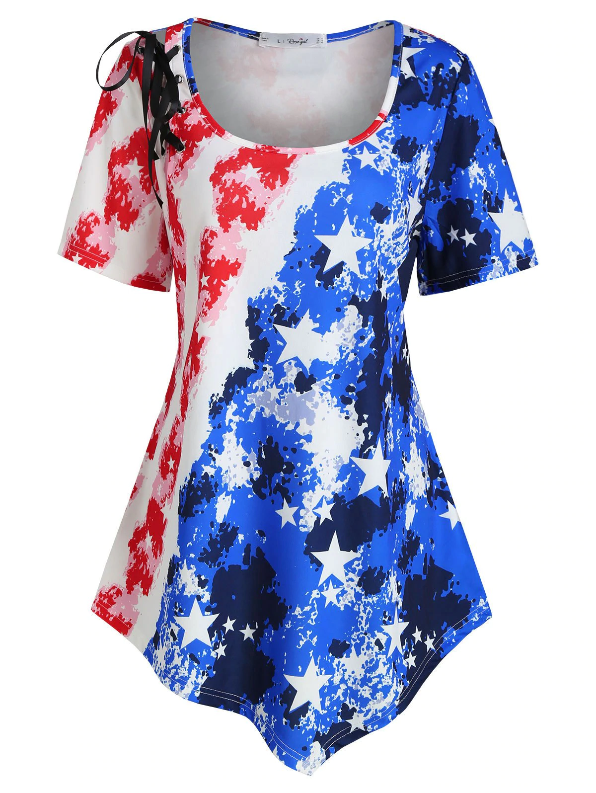 Show off your patriotic spirit this summer season by sporting this lightweight T-shirt with a colorful American flag print and a flowy asymmetric hem.