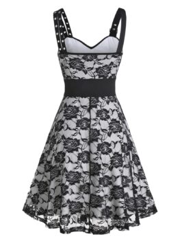 What makes this gothic dress unique is the shoulder straps that have a buckle strap on one side, while the other has dual grommet straps. The lace overlay is in flower patterns to add a feminine sense. And the empire waist shows off your slim waist, while gives the illusion of an elongated, more slender…