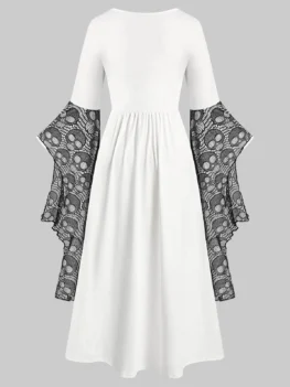 Get yourself for the upcoming party in this graceful dress carefully cut in an A-line silhouette with dip-hem details and delicate yoke laces to show glimpses of the appealing skins. The high-rise waist greatly lengthens the figure. Style: Fashion Material: Polyester,Polyurethane Silhouette: A-Line Dresses Length: Mid-Calf Neckline: Round Collar Sleeve Length: Short Sleeves Waist: High Waisted Embellishment: Lace,See Thru Pattern Type: Solid Color…