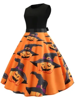 Pumpkin Print Belted Sleeveless Halloween Dress