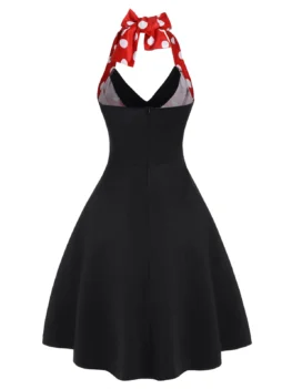 Adorable polka dot spread on the top part of the dress to make a contrast visual effect with the solid bottom part. Six large decorative buttons help to highlight your slim waist. And the self-tie straps fashion into large bowknot at the nape forming a chic halter neck.   Style: Vintage Occasion: Cocktail & Party,Homecoming,Prom Material: Polyester Silhouette: A-Line…