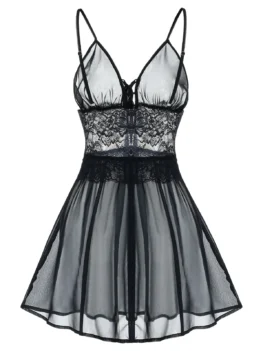 Sexy Lace Up See Through Lace and Mesh Babydoll Dress