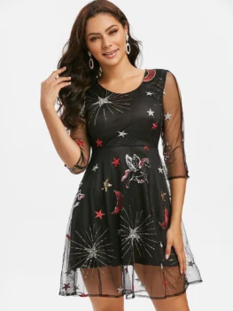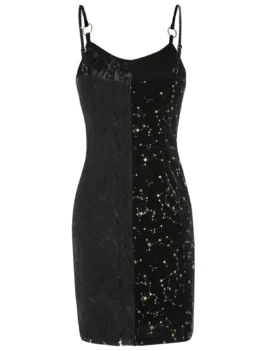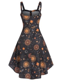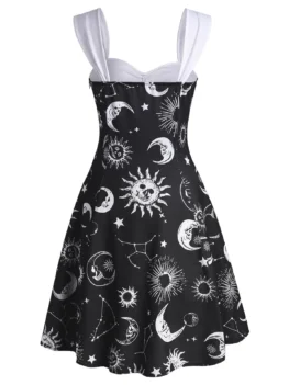 Try this sun, moon and star print dress which features an alluring backless design, while the crisscross straps make it more inviting. The lace overlay adds an elegant feeling. And the large O rings separate it apart from others in a wonderful way. Style: Gothic Occasion: Casual Material: Polyester Silhouette: A-Line Dresses Length: Mid-Calf Neckline: Scoop Neck Sleeve Length: Sleeveless Embellishment: Criss-Cross,Lace…