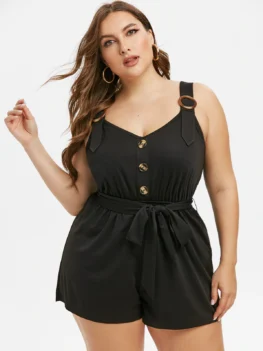 Get a casual easy look in this pull-on romper cut with wide-legs and fashioned with front row buttons down to the waist and a sweetheart neck to amp up the flirty look. A self-tie belt helps to slim as well as elongate the waist. Gender: For Women Material: Polyester,Polyurethane Fit Type: Regular Neckline: Sweetheart Neck Sleeve Length: Sleeveless Pattern…