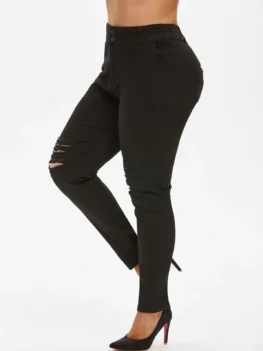 Style: Fashion Length: Normal Material: Cotton,Spandex Fit Type: Skinny Waist Type: High Closure Type: Zipper Fly Front Style: Flat Pattern Type: Solid Embellishment: Pockets,Ripped Pant Style: Pencil Pants Wash: Dark Wash Elasticity: Elastic With Belt: No Weight: 0.5000kg