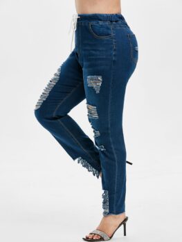 • Ripped Frayed Hem Drawstring Plus Size Skinny Jeans
