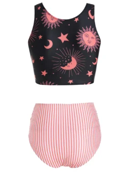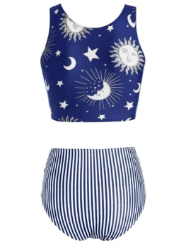 This mix and match tankini swimwear features a flounce overlay that is printed with sun, moon and star pattern. Three straps at each shoulder crisscross at the back, forming a chic strappy design. The unique scrunch butt bottom has a high rise that pulls off a very chic look. Style: Fashion Swimwear Type: Tankini Gender: For Women…
