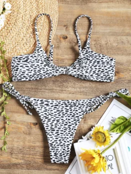 In a sexy yet cute style, this paired bikini set feature in a spotted pattern throughout, eye-catching twist design in the front with a removable padded cup. Tie side string swim bottoms in a thong shape detail. It will be a best choice for you. Style: Cute Swimwear Type: Bikini Bikini Type: String Bikini Gender: For Women Material: Polyester,Spandex…