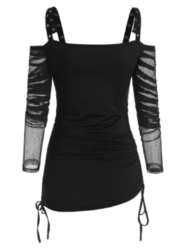 Style: Gothic Material: Polyester,Polyurethane Collar: Square Neck Shirt Length: Regular Sleeve Length: Full Sleeve Type: Cold Shoulder Pattern Type: Floral,Skull Embellishment: Mesh,Ruched Season: Fall,Spring Elasticity: Elastic Weight: 0.2400kg Package Contents: 1 x Top