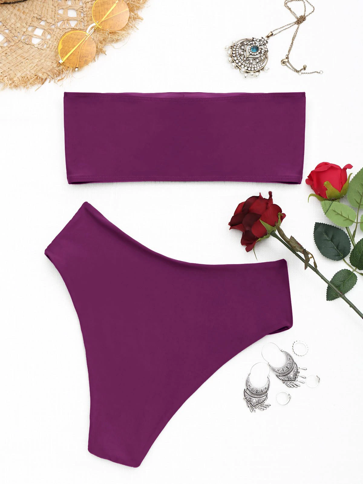 This bandeau bikini set in a solid color hue features a strapless straight cut shape with a softly padded bust, high cut leg designed on the thighs for a sexy look with moderate fit style. Brief yet flattering, it would be a good choice for beachwear.