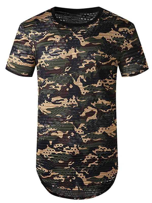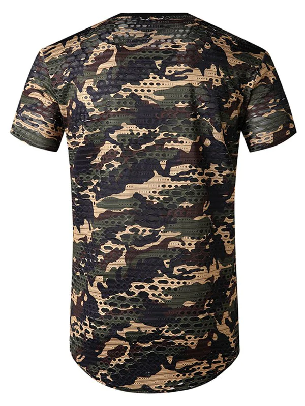 Camouflage Print Mesh Patch Hole Curved T Shirt