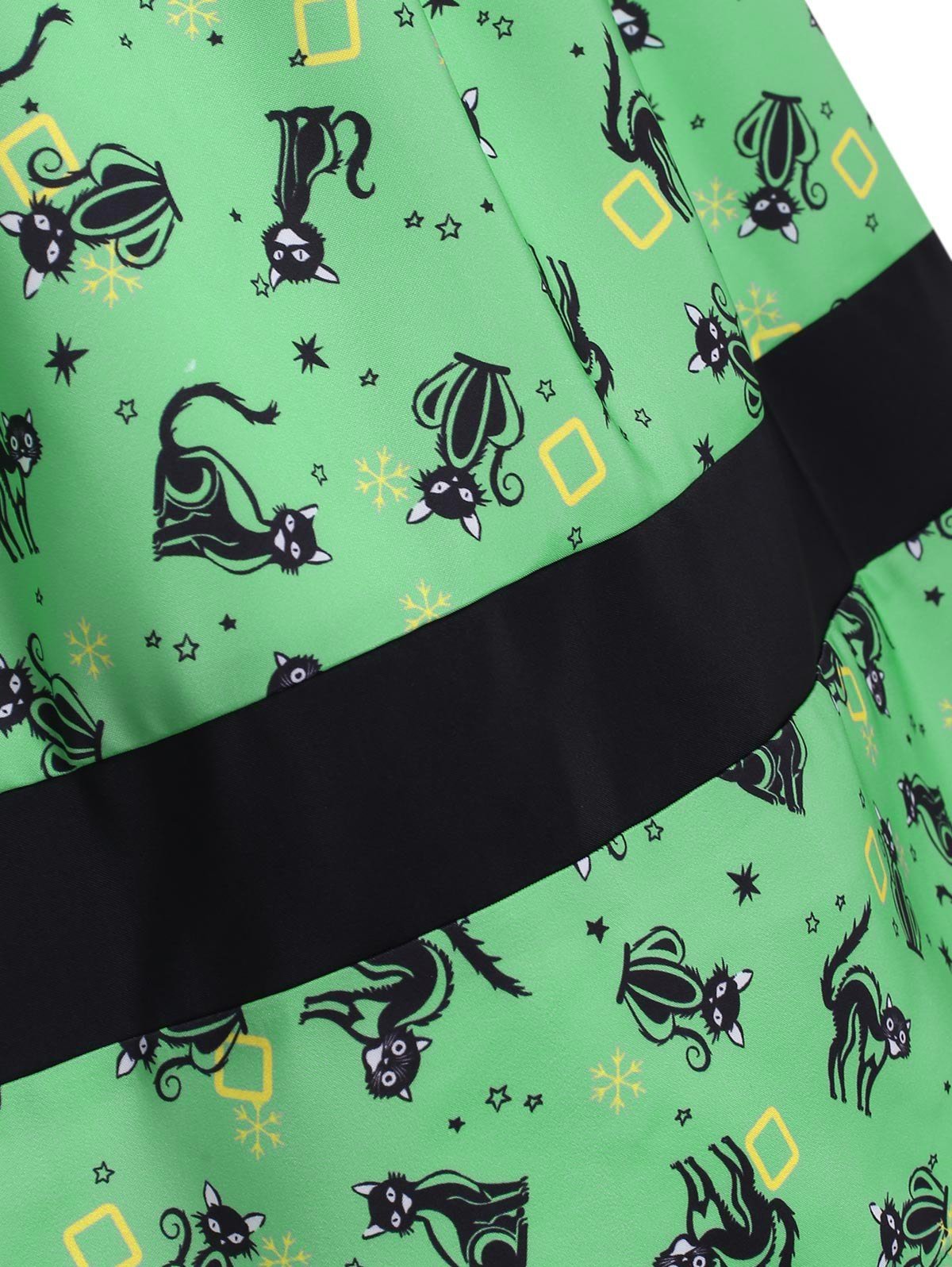 Printed with snowflake, black cat and stars, this dress is suitable for Halloween or Christmas party! The scoop neck is low enough to flaunt your beautiful collarbone. And matching waist belt is added for a better curvy effect.