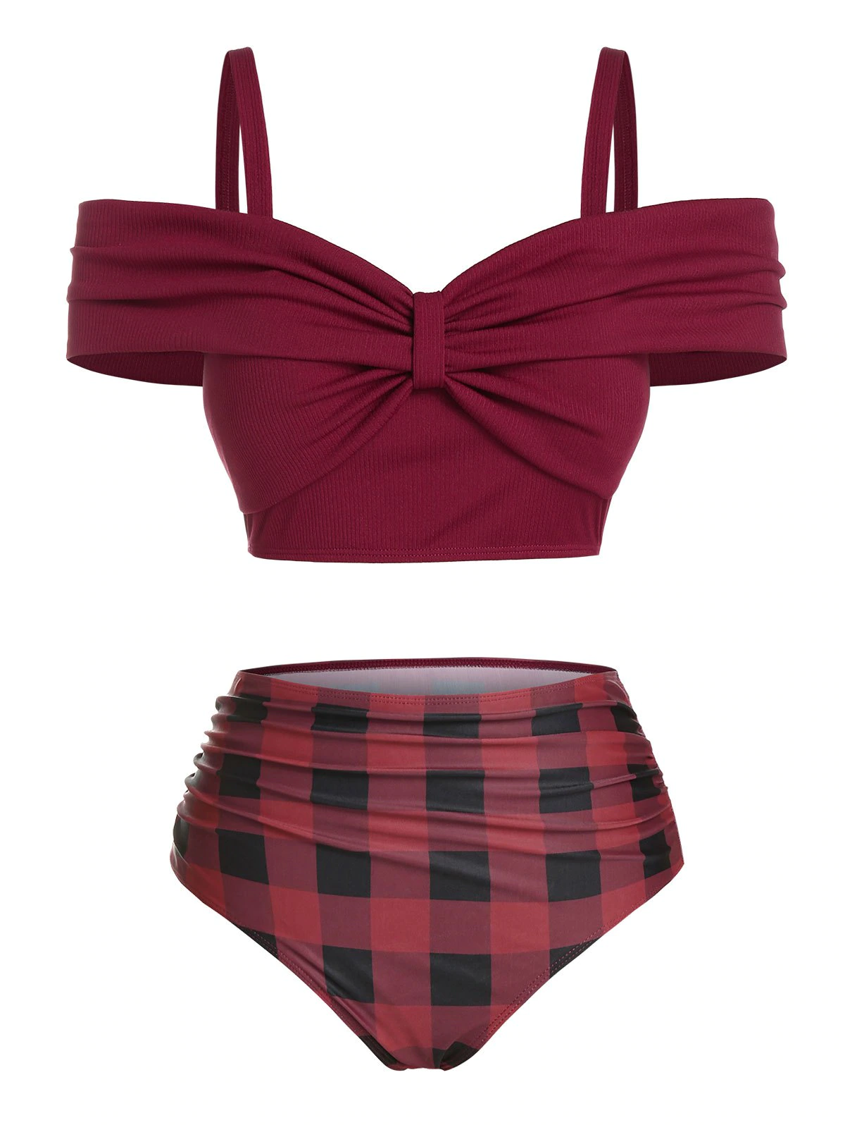 Cold Shoulder Plaid Print High Waisted Tankini Swimwear