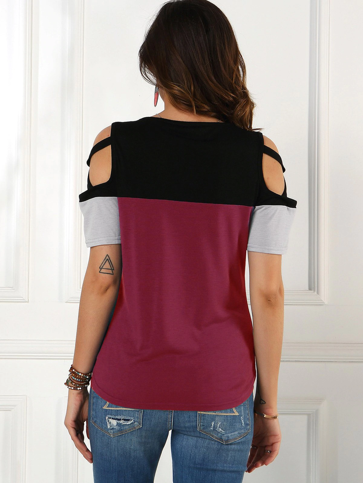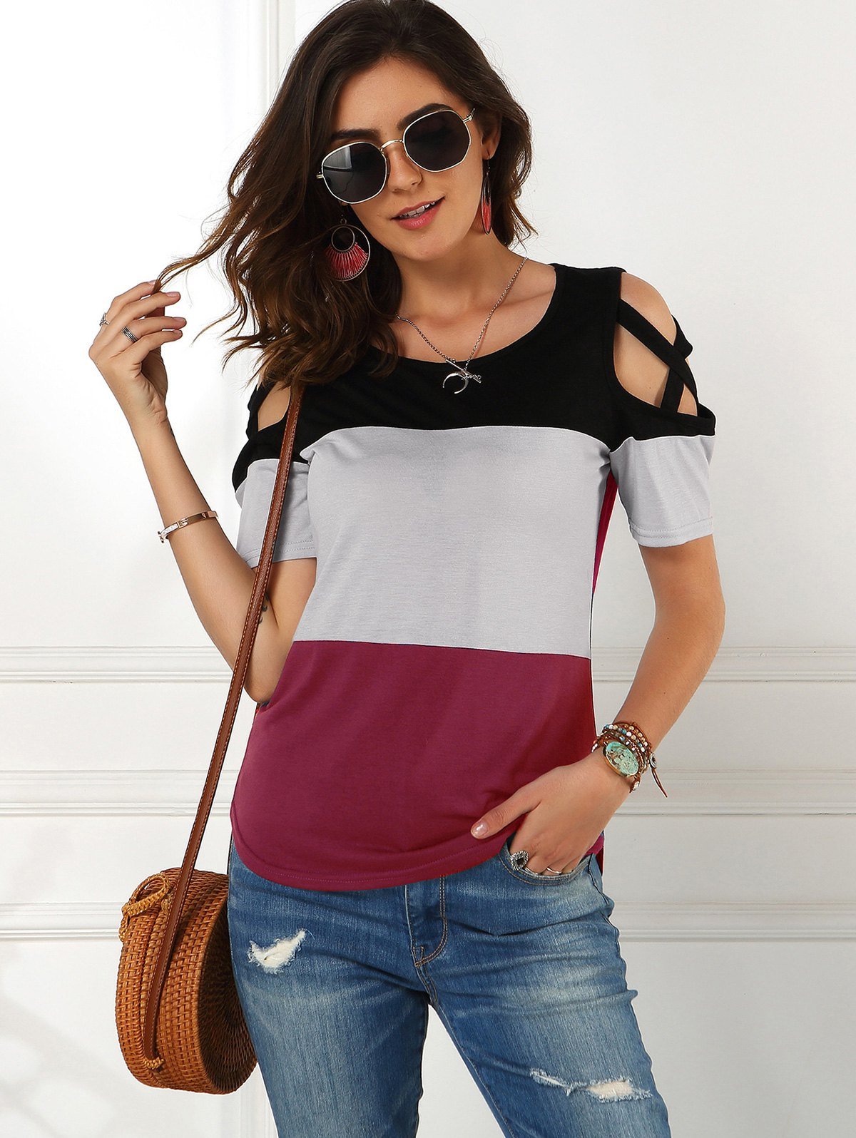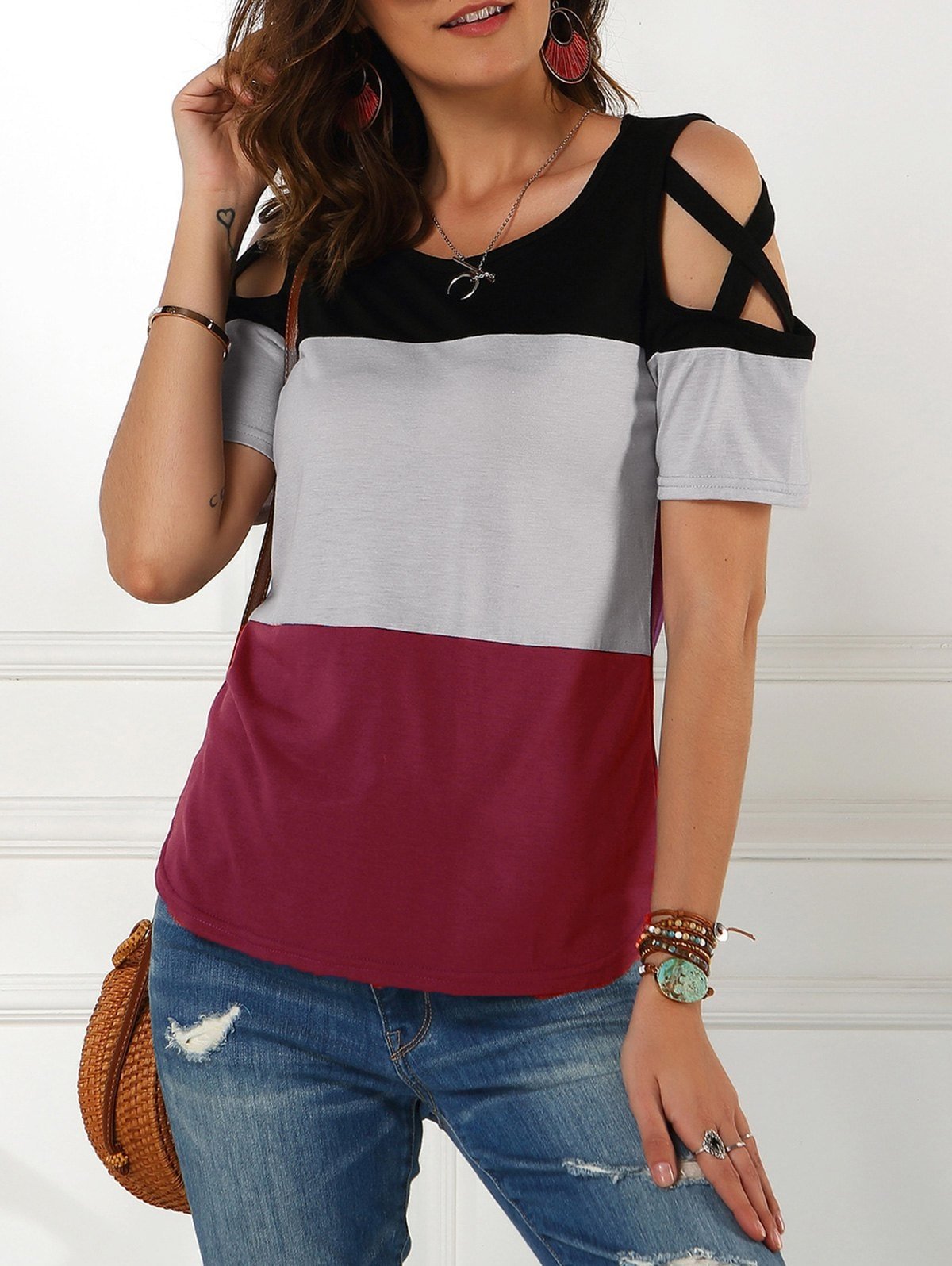 Colorblock Cold Shoulder Criss Cross Tee