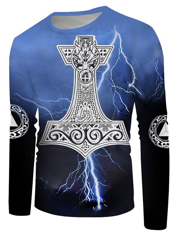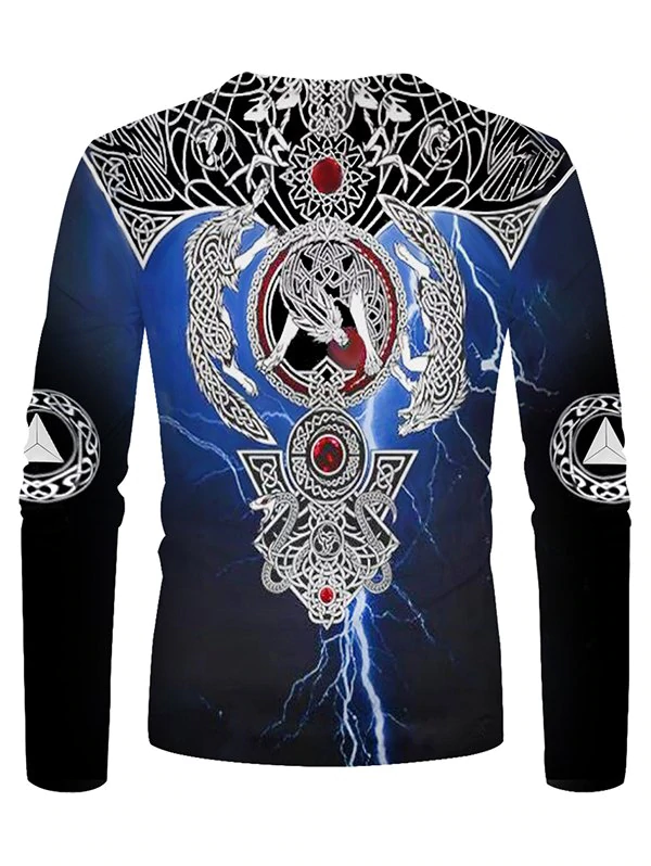 Crew Neck Lightning Wolf Pattern Long Sleeve Casual Tee