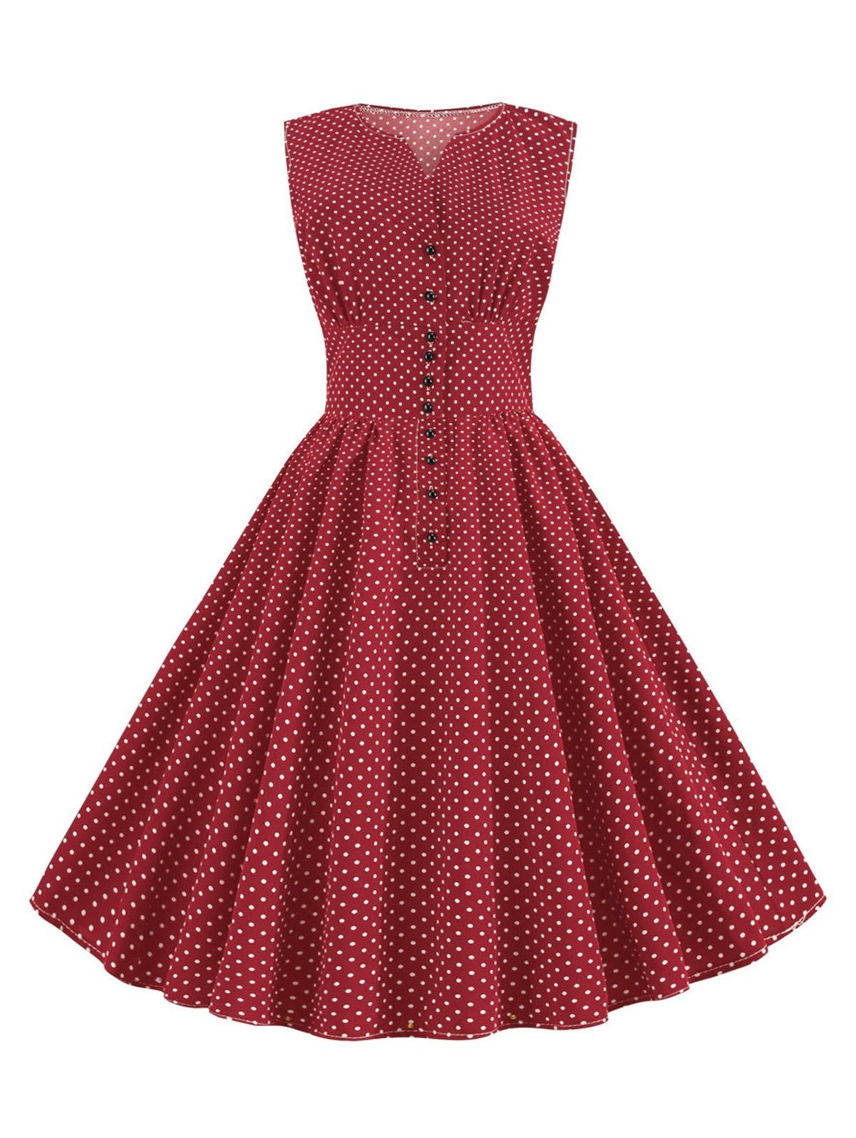 Covered in ditsy polka dots to amp up the vintage vibes, this waist-flaunting dress is designed with a wide waistband and front row buttons that make you instantly look taller.