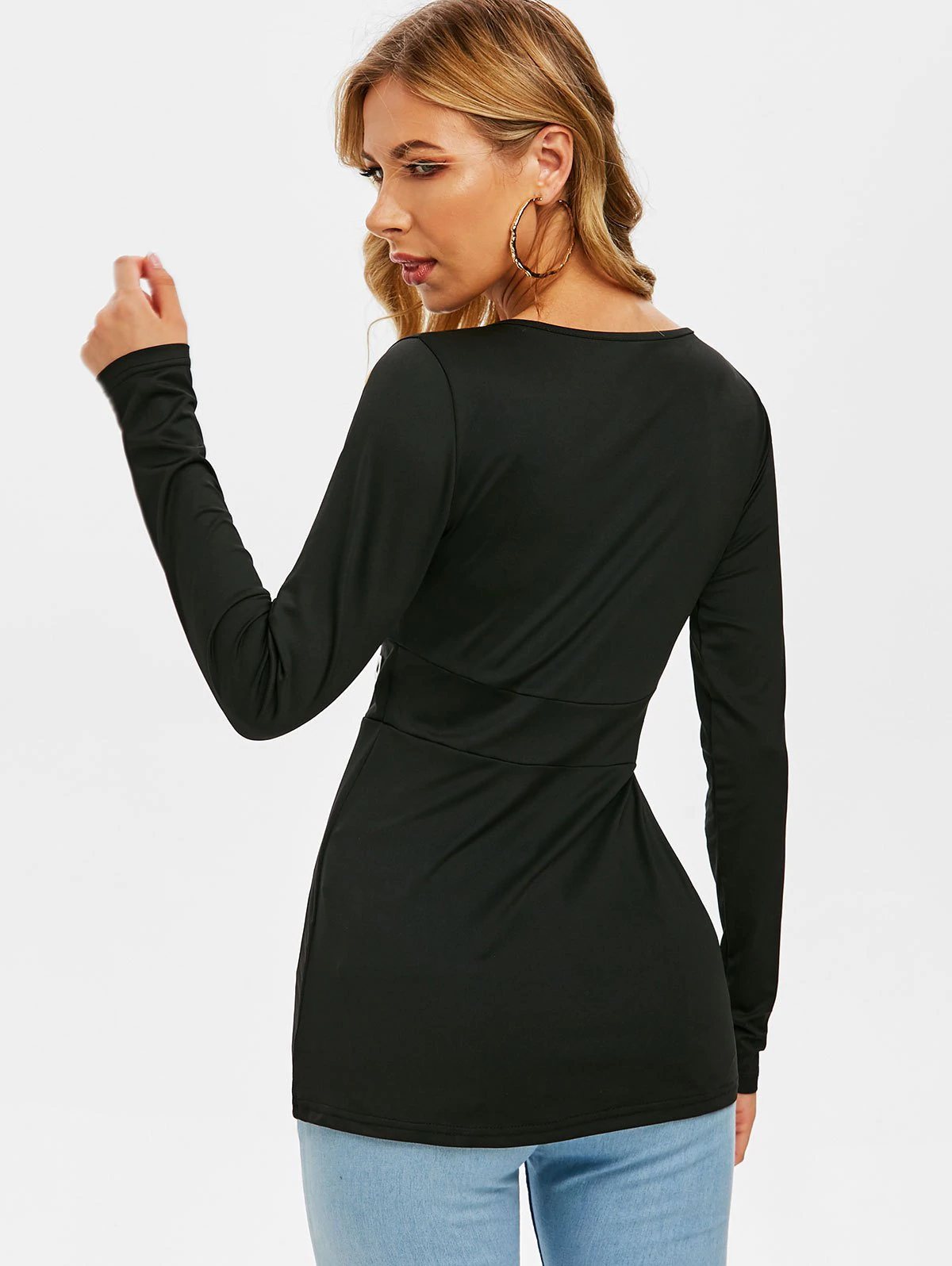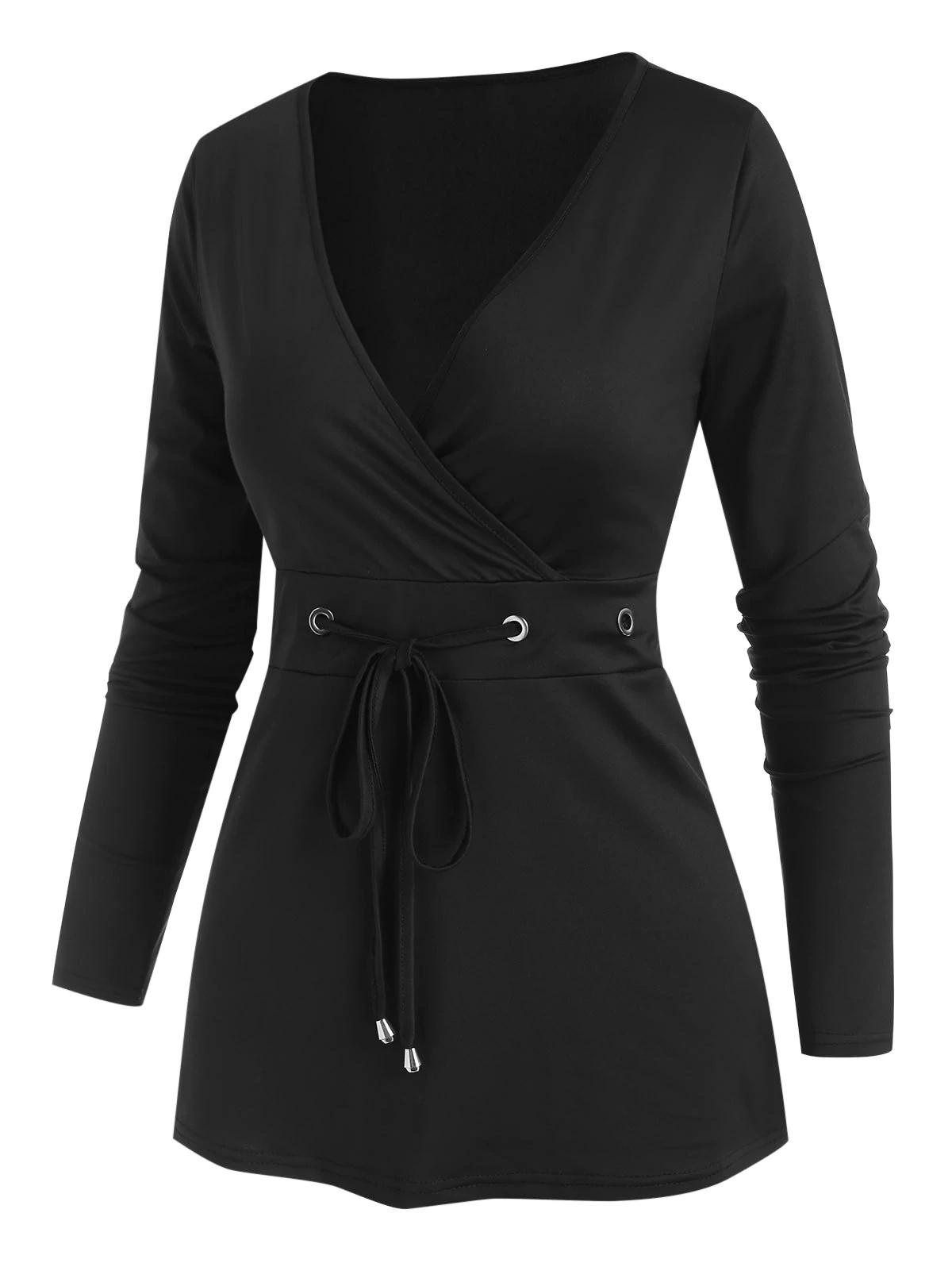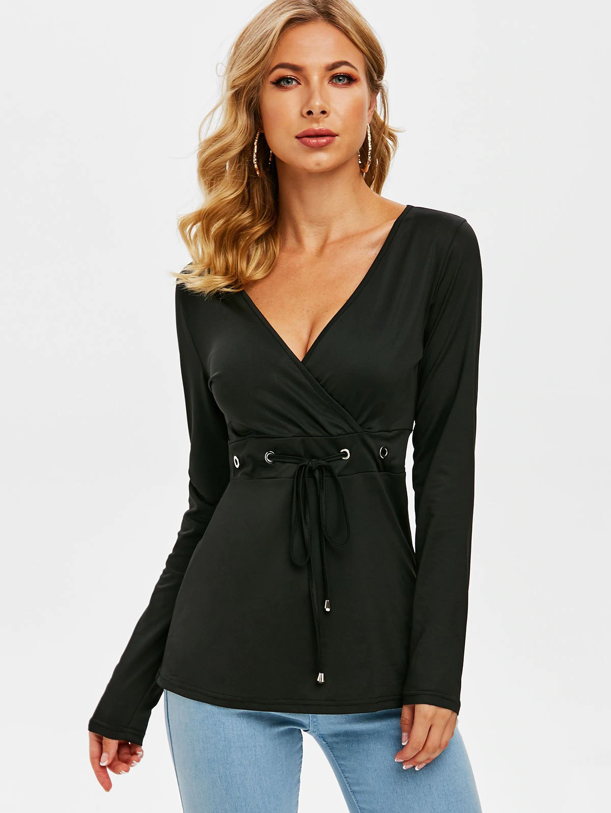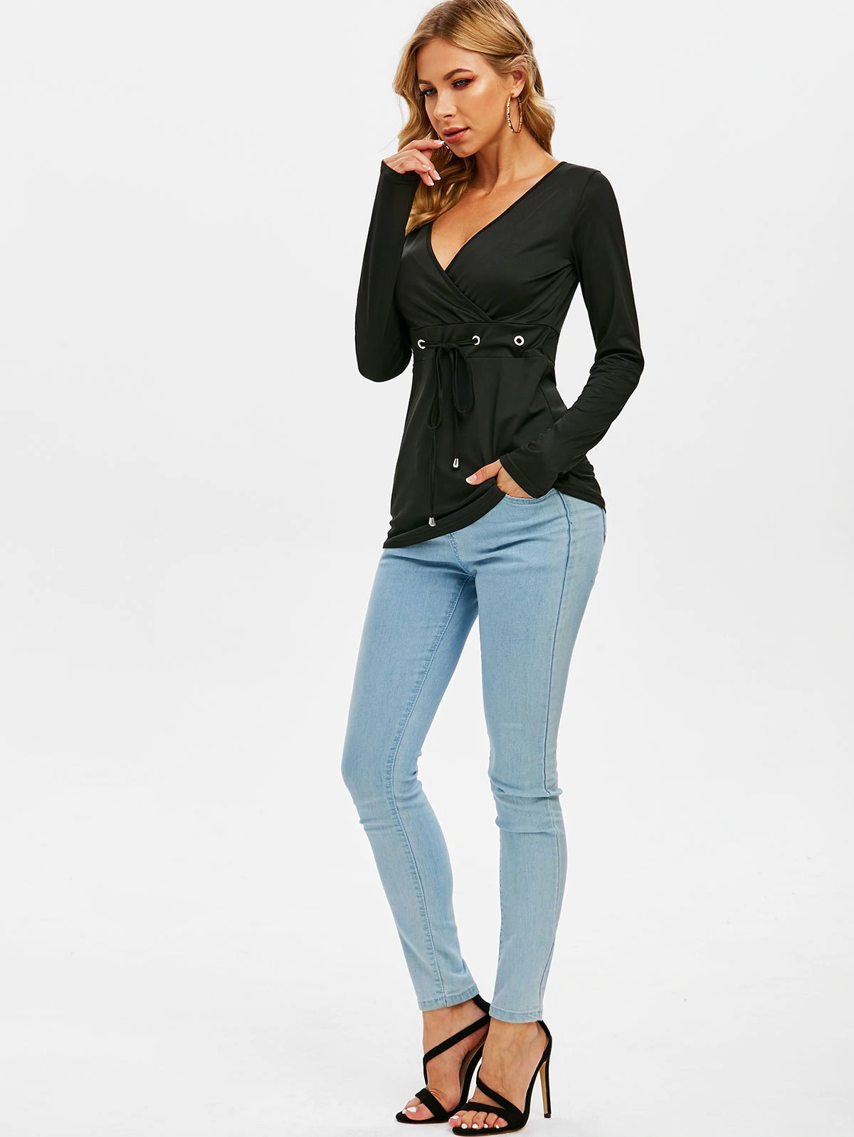 Drawstring Waist Long Sleeve Surplice T-shirt