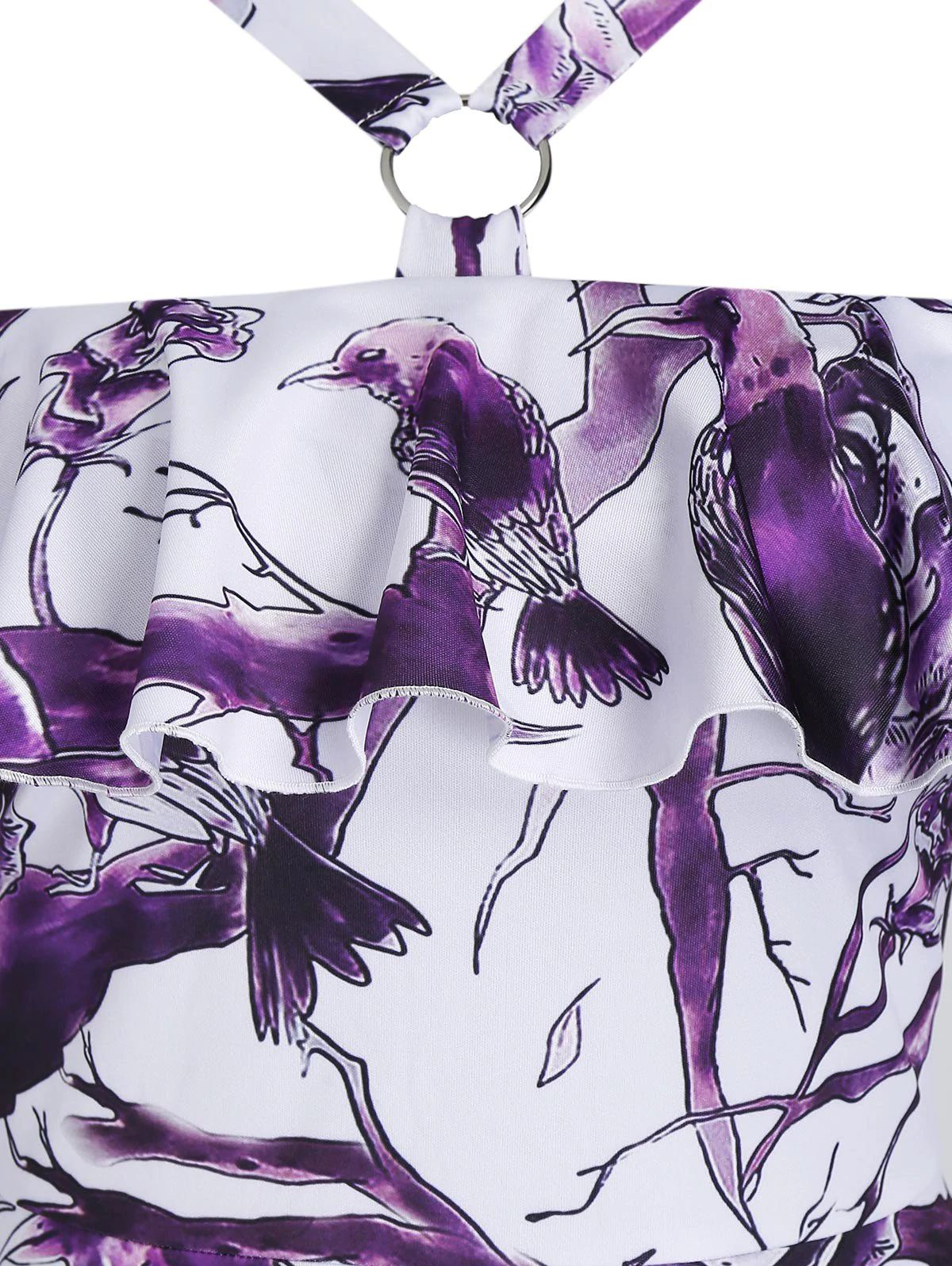 Exposed Shoulder Birds Print Ruffle Mini High Waist Dress