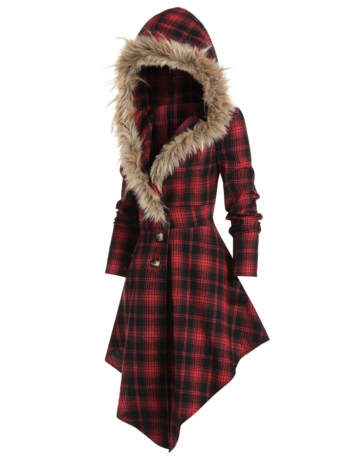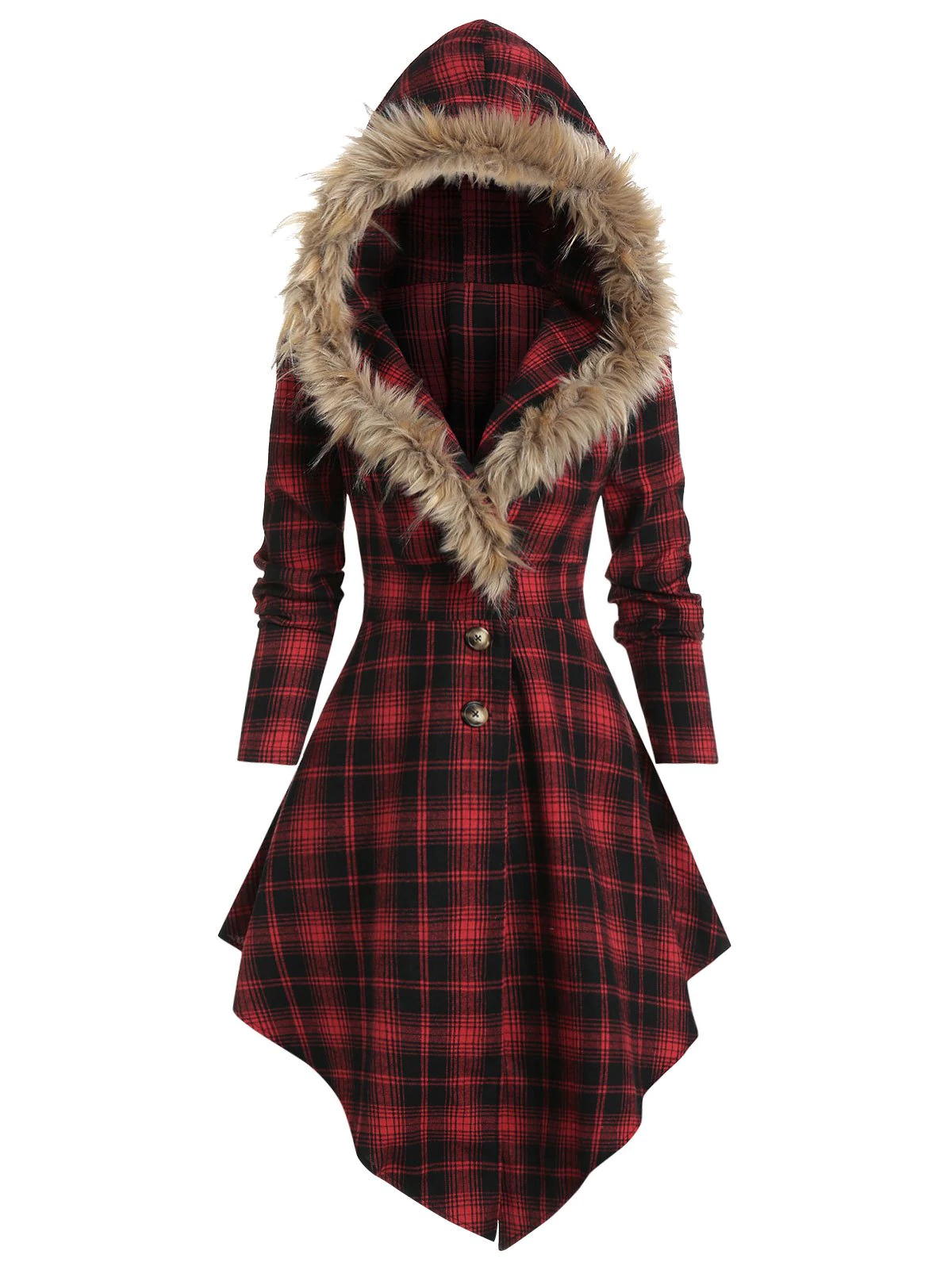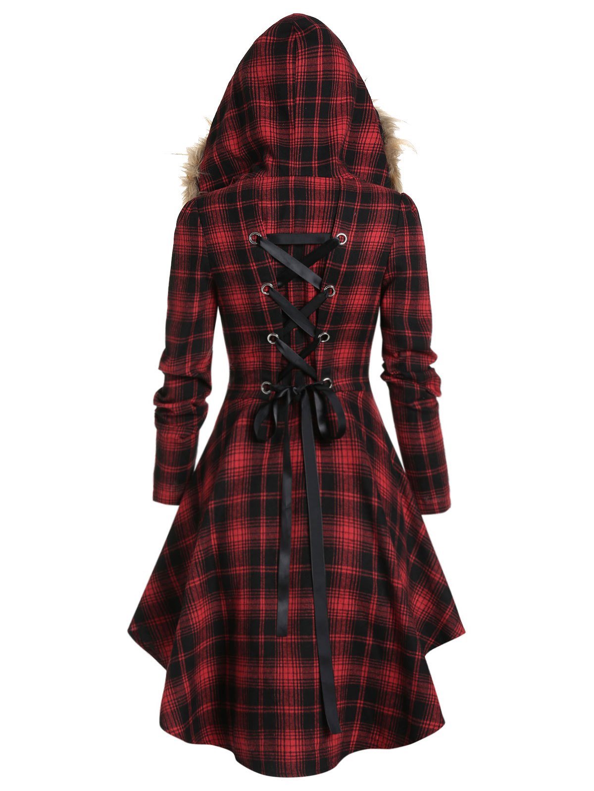 Faux Fur Hooded Plaid Print Lace-up Skirted Coat