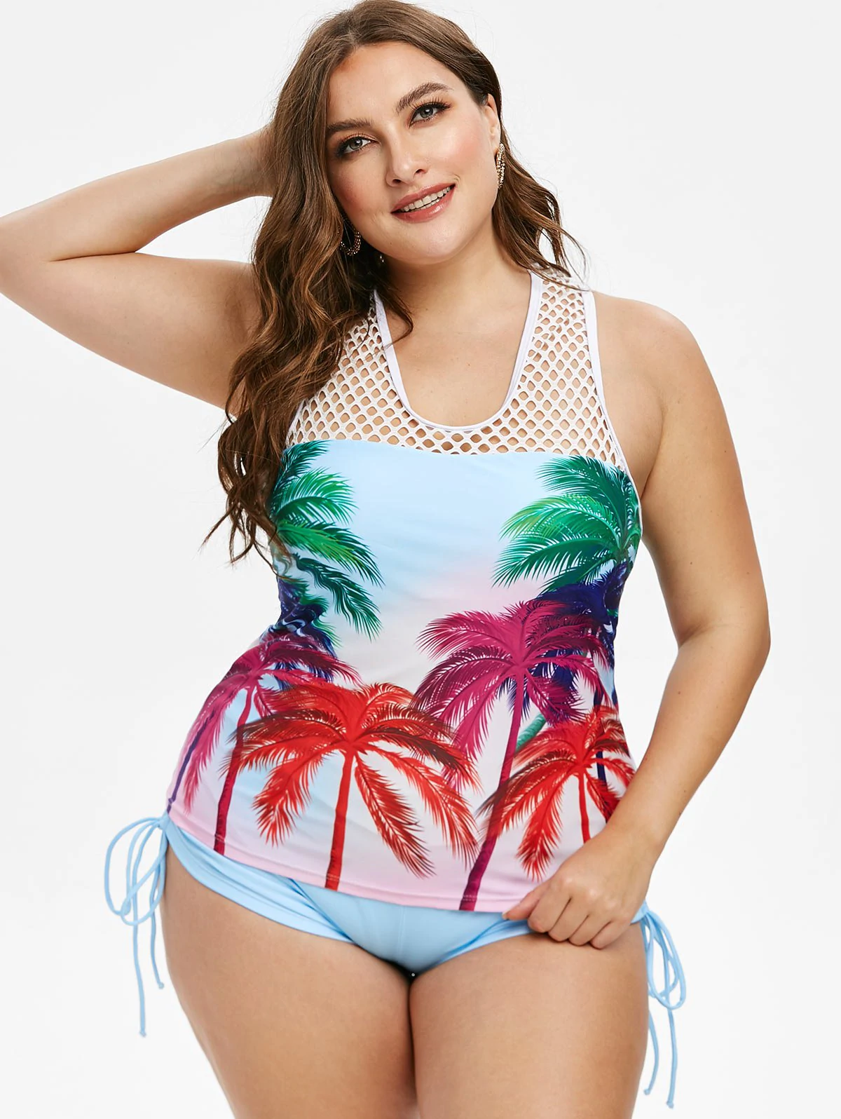 Fishnet Panel Palm Tree Cinched Plus Size Tankini Swimwear