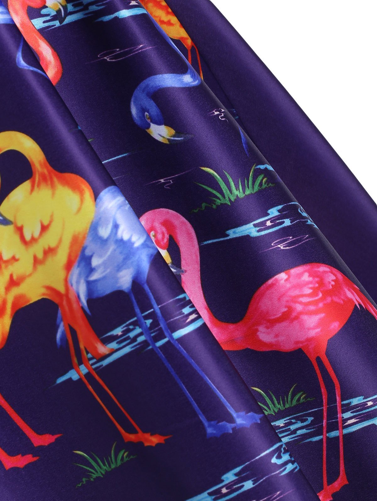 This elegant dress is attractive due to the flamingo pattern. The figure-flattering empire waist is defined through the wide waistband which has lace-up at sides for decoration. And the dip hem gives a chance to show off your shapely legs.
