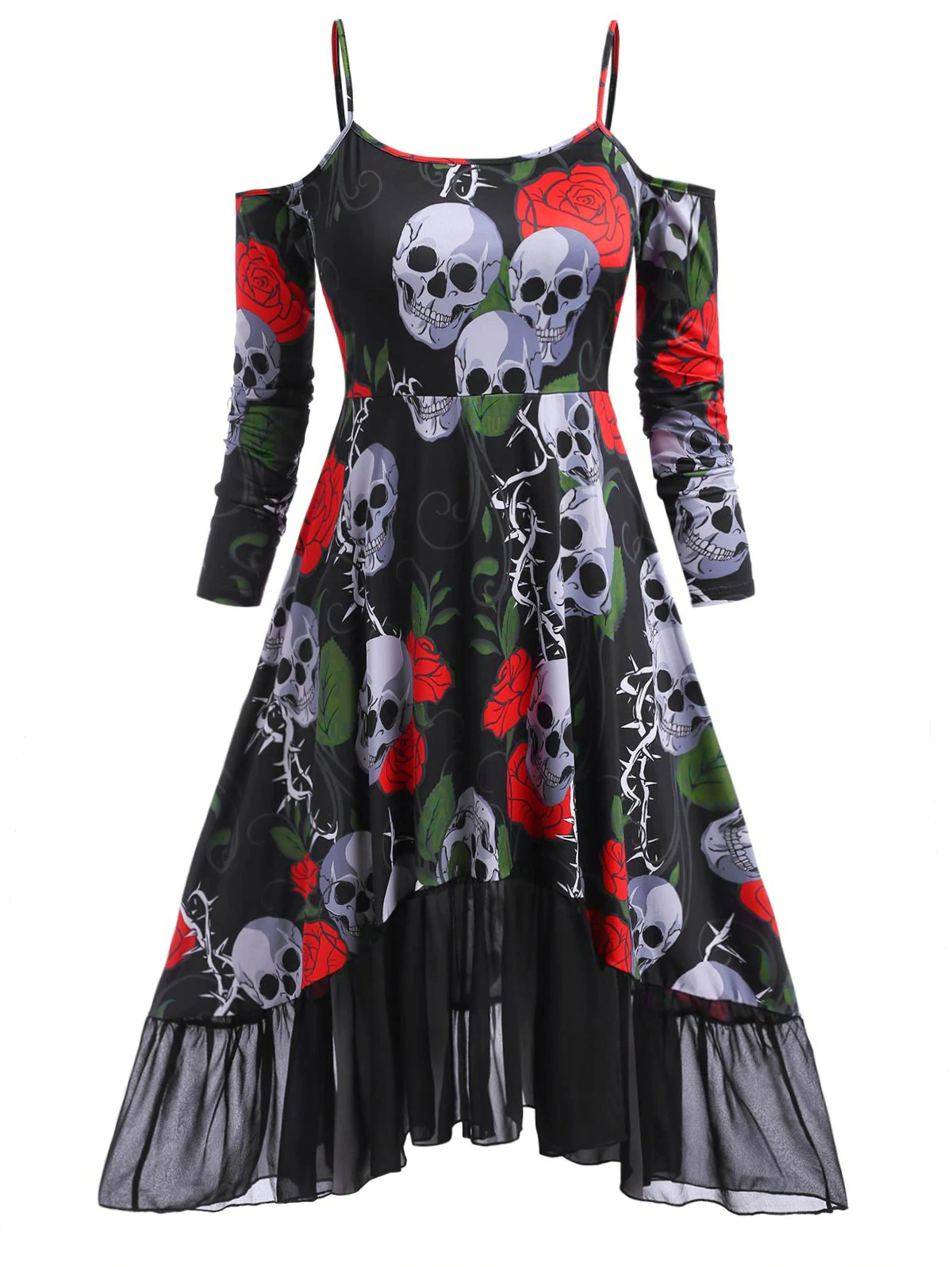 Floral Skull Open Shoulder High Low Halloween Plus Size Dress