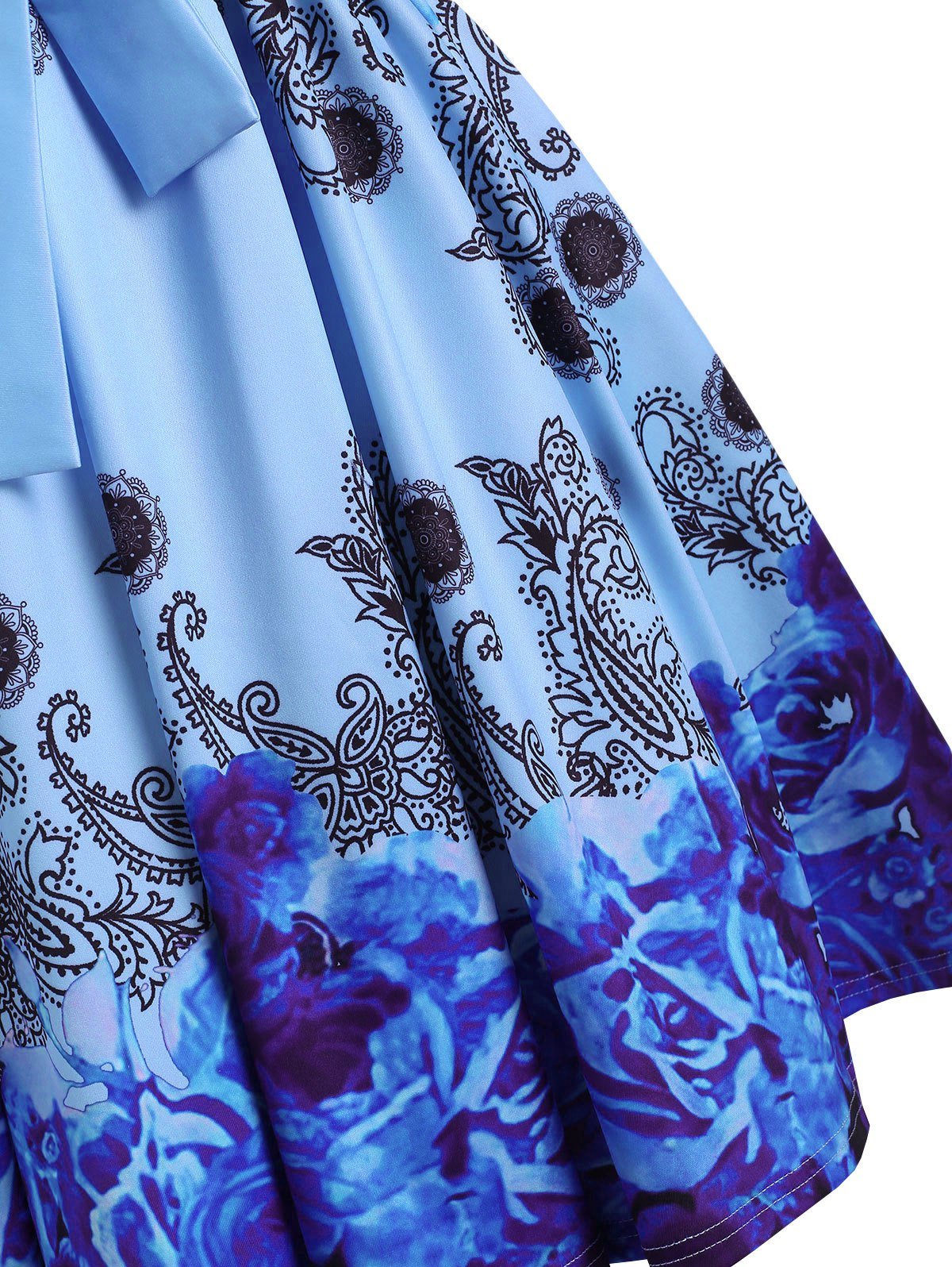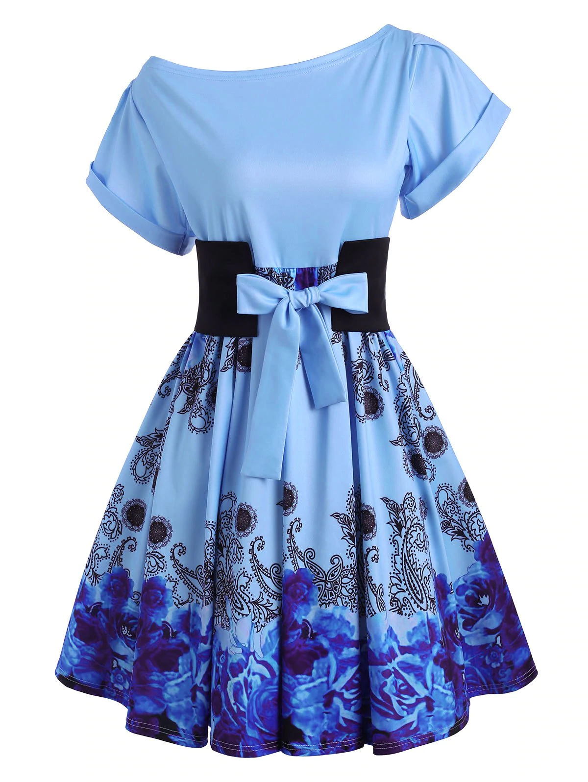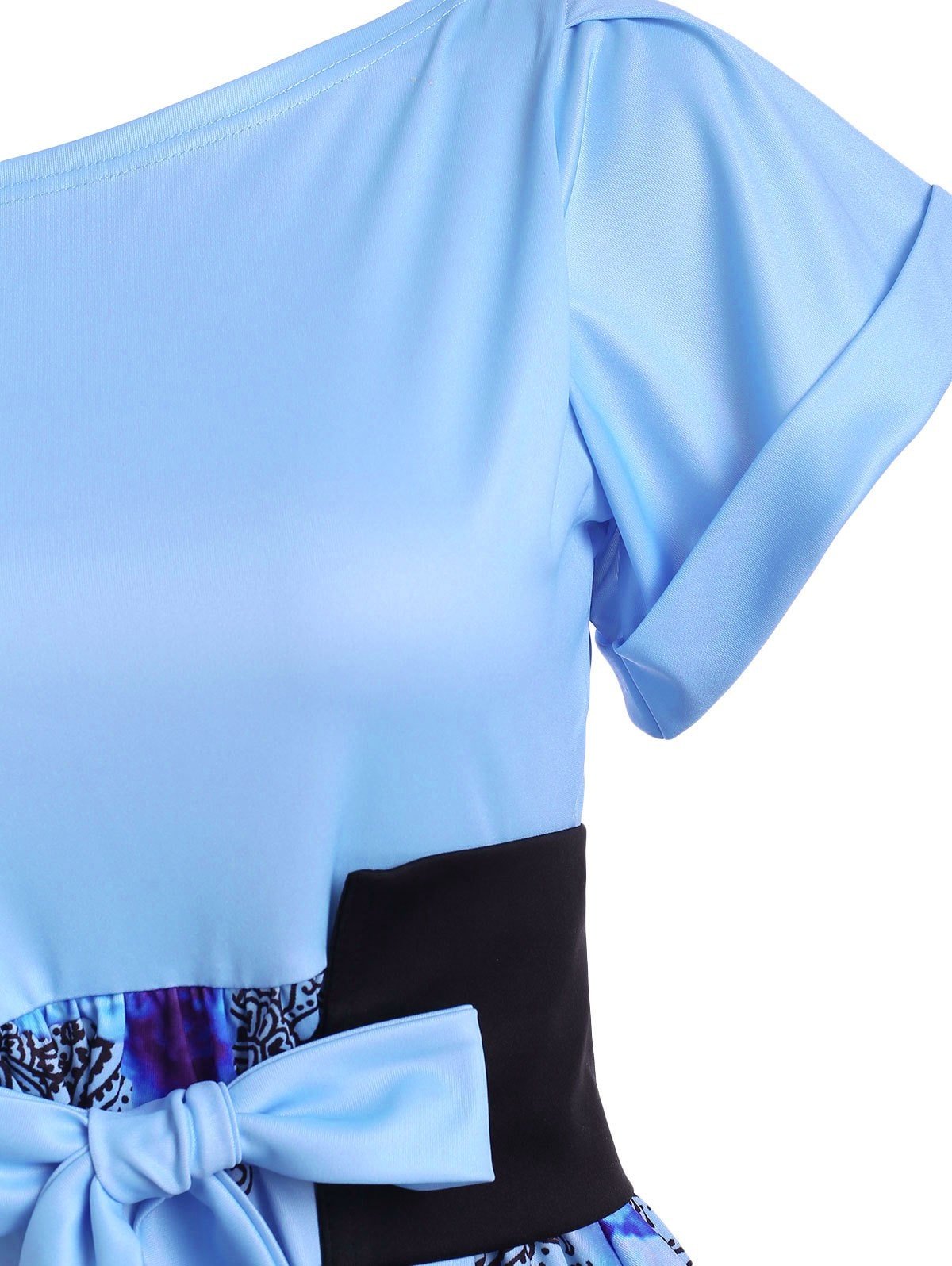 Flower Cuffed Sleeve Skew Collar Belted Dress