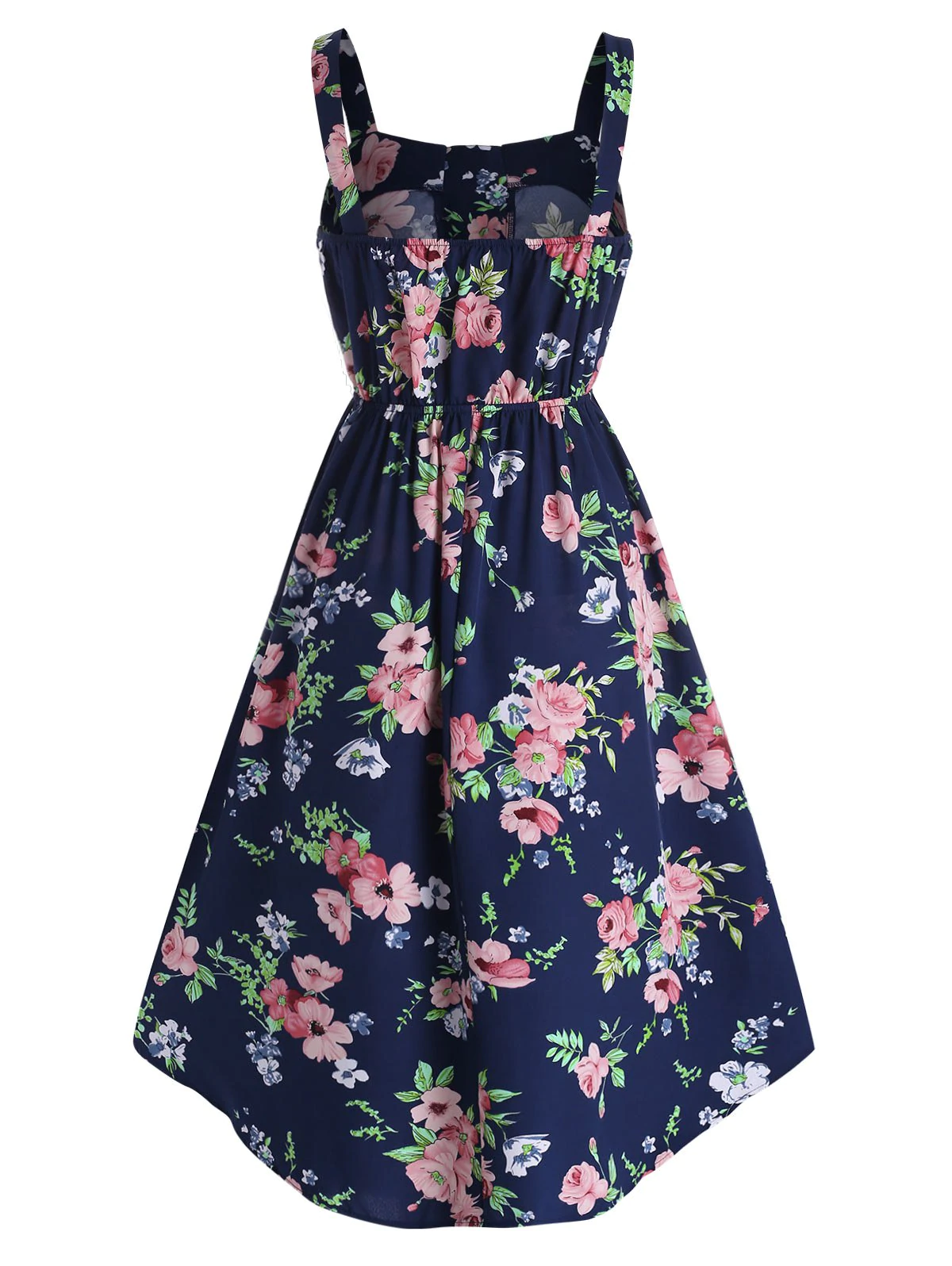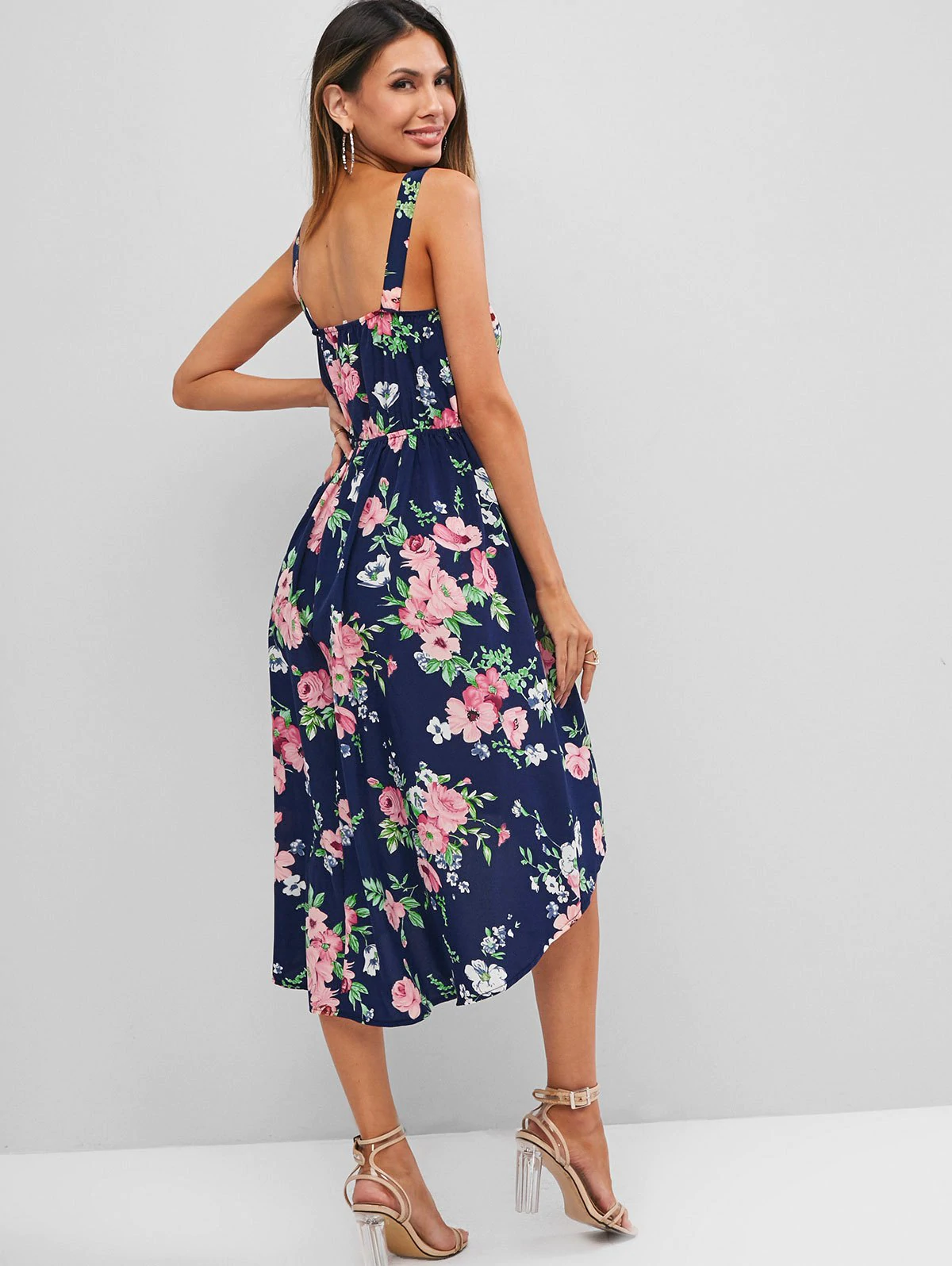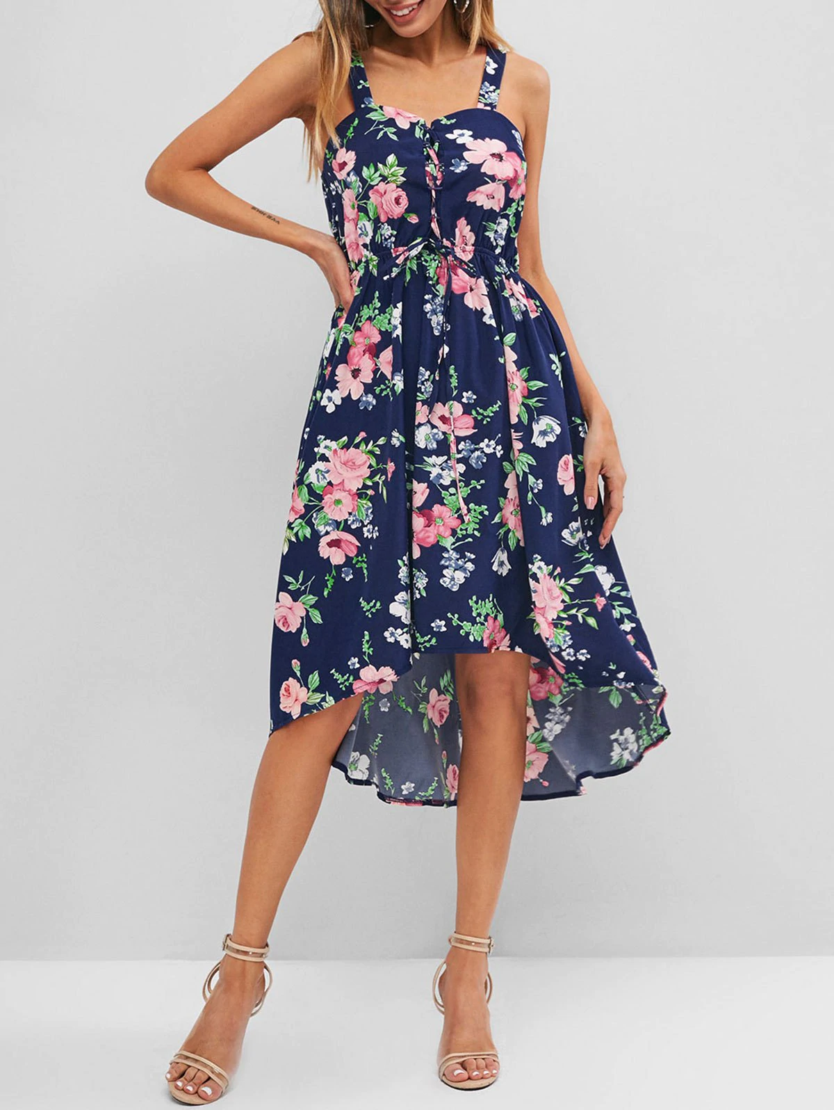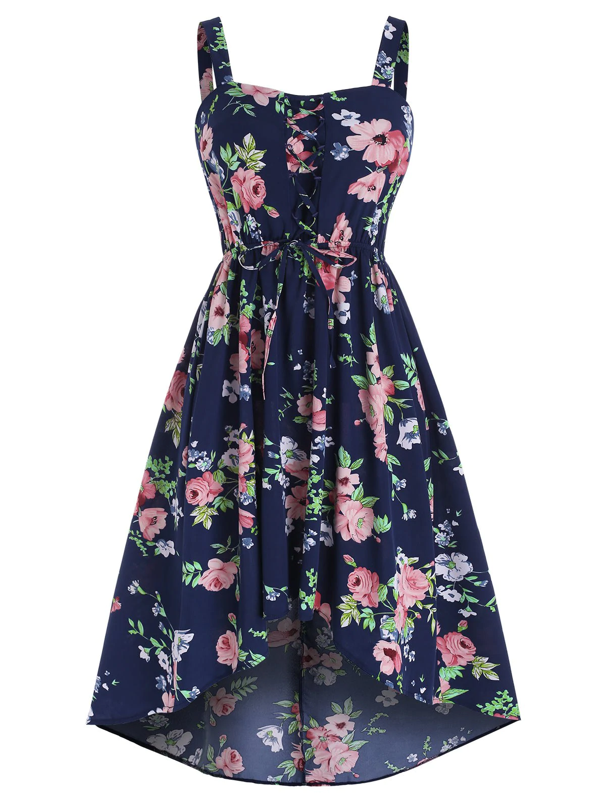 Your next vacay is ready with this feminine floral print dress! The lace-up gathers the front to accentuate your bust shape, and the dip hem perfectly gives an elongated look. Your beautiful back is exposed with the help of wide shoulder straps.