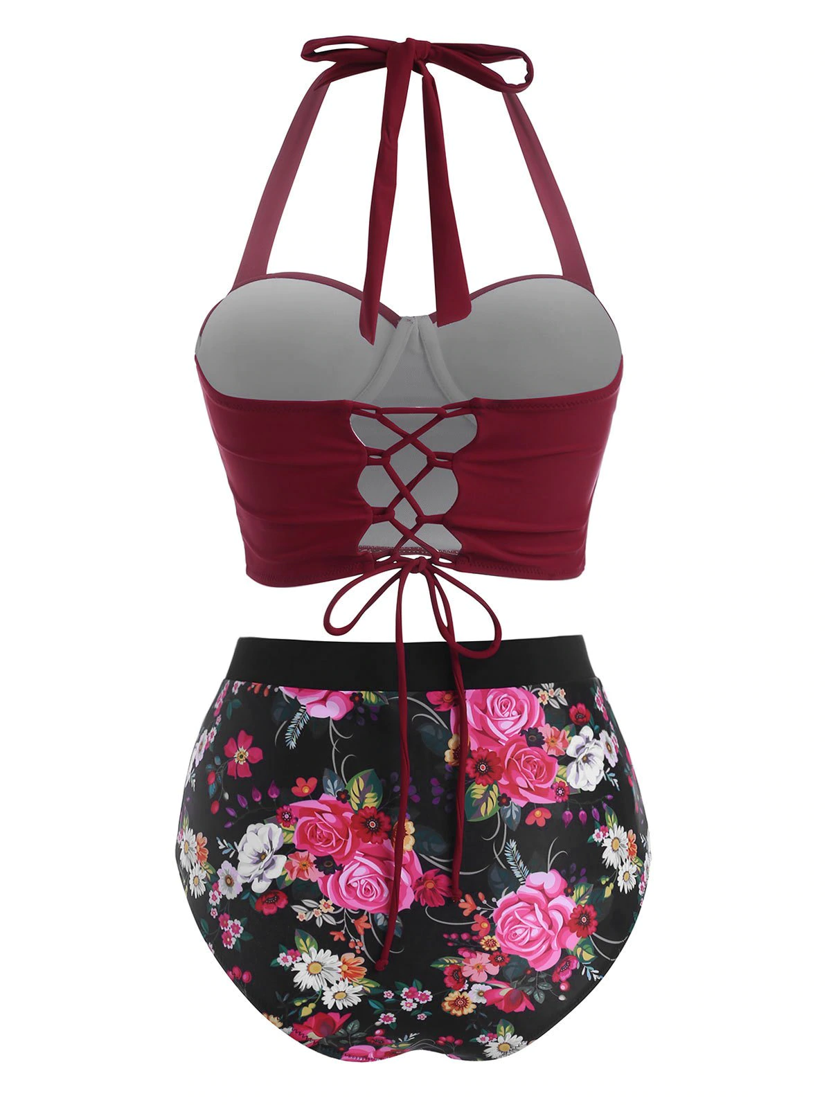 Flaunt your figure with this mix and match tankini. The solid top has a push-up design that helps to accentuate your bust shape, and the back lace-up closure echoes well with the halter neck to give you a comfortable wearing experience. The feminine flower print bottom is high waisted to offer a slimline look.