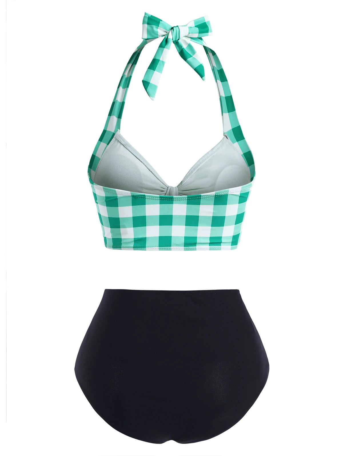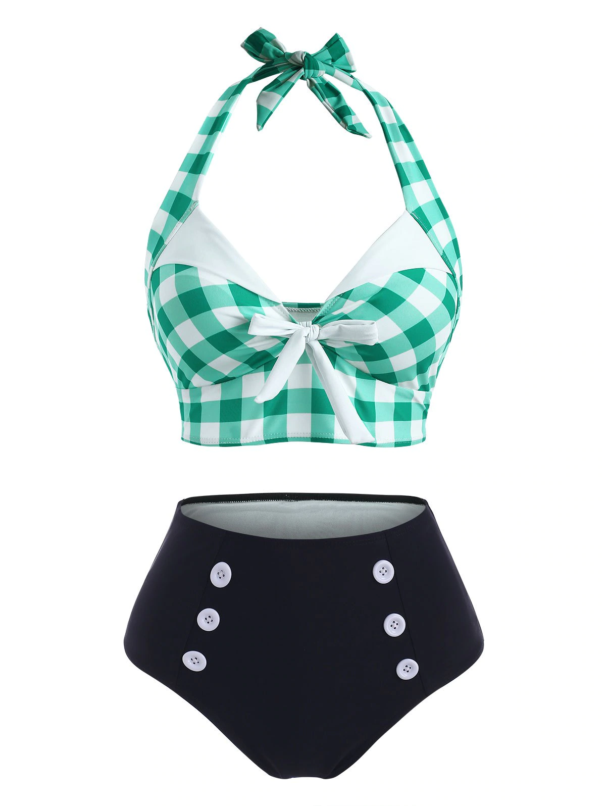 Gingham Mock Button Halter Bowknot Tankini Swimwear