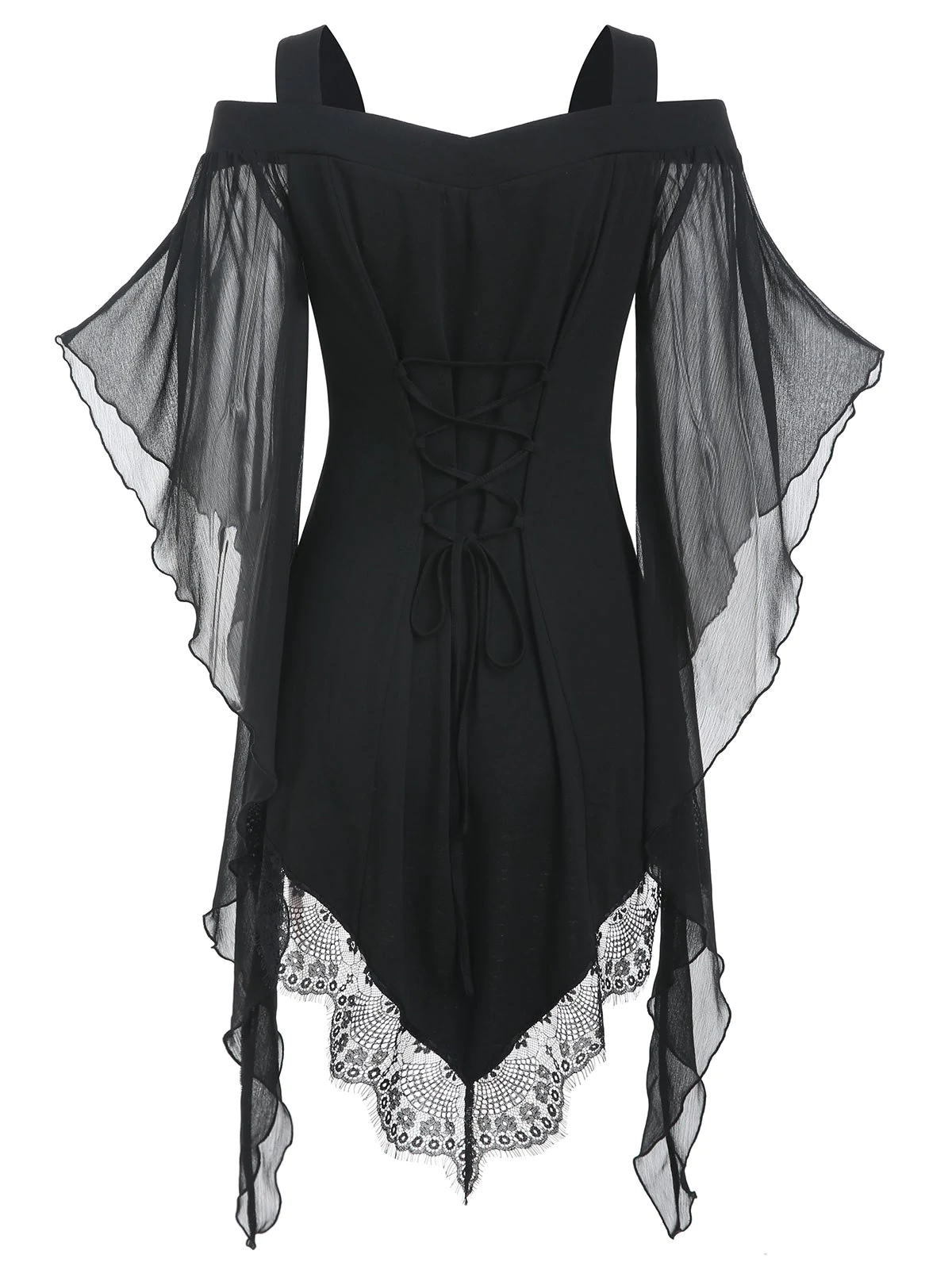 Gothic Criss Cross Lace Insert Butterfly Sleeve T-shirt