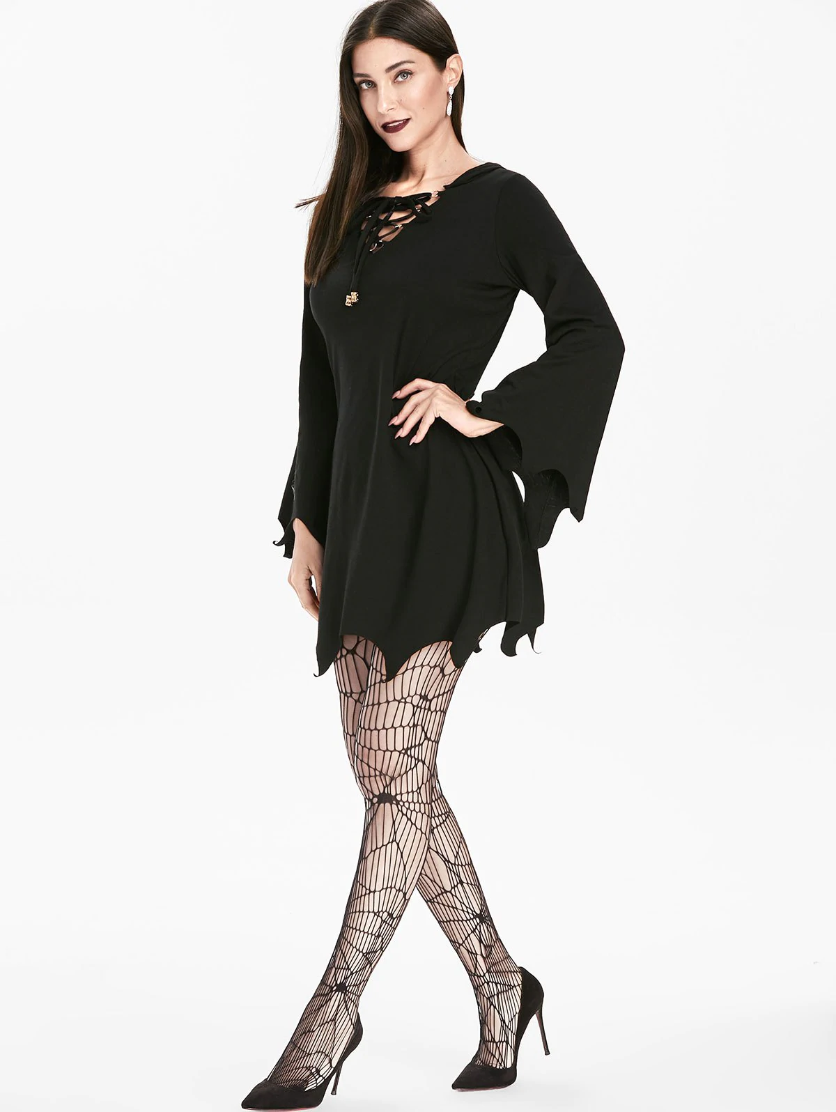 Gothic Hooded Lace Up Sharkbite Trim Dress