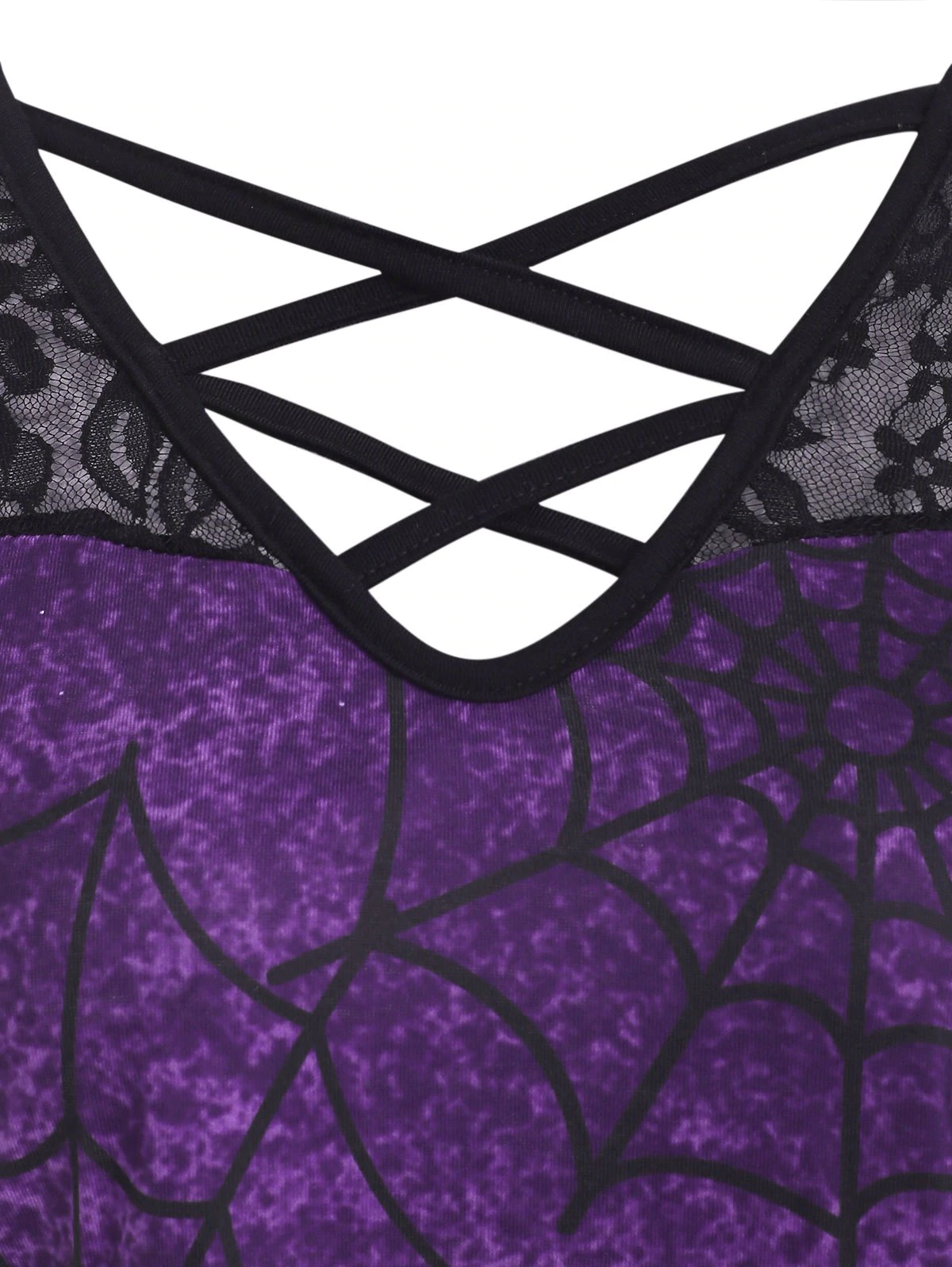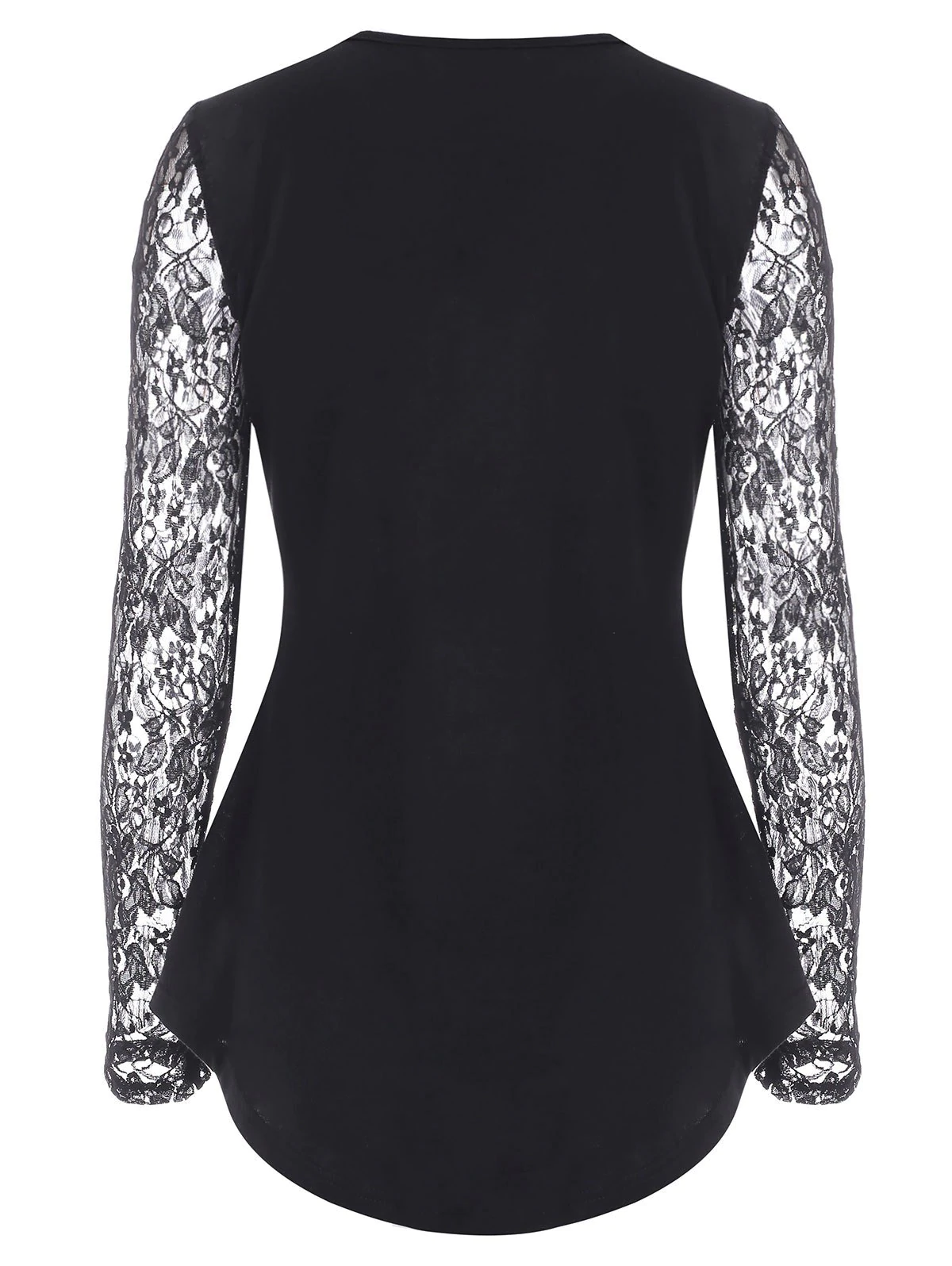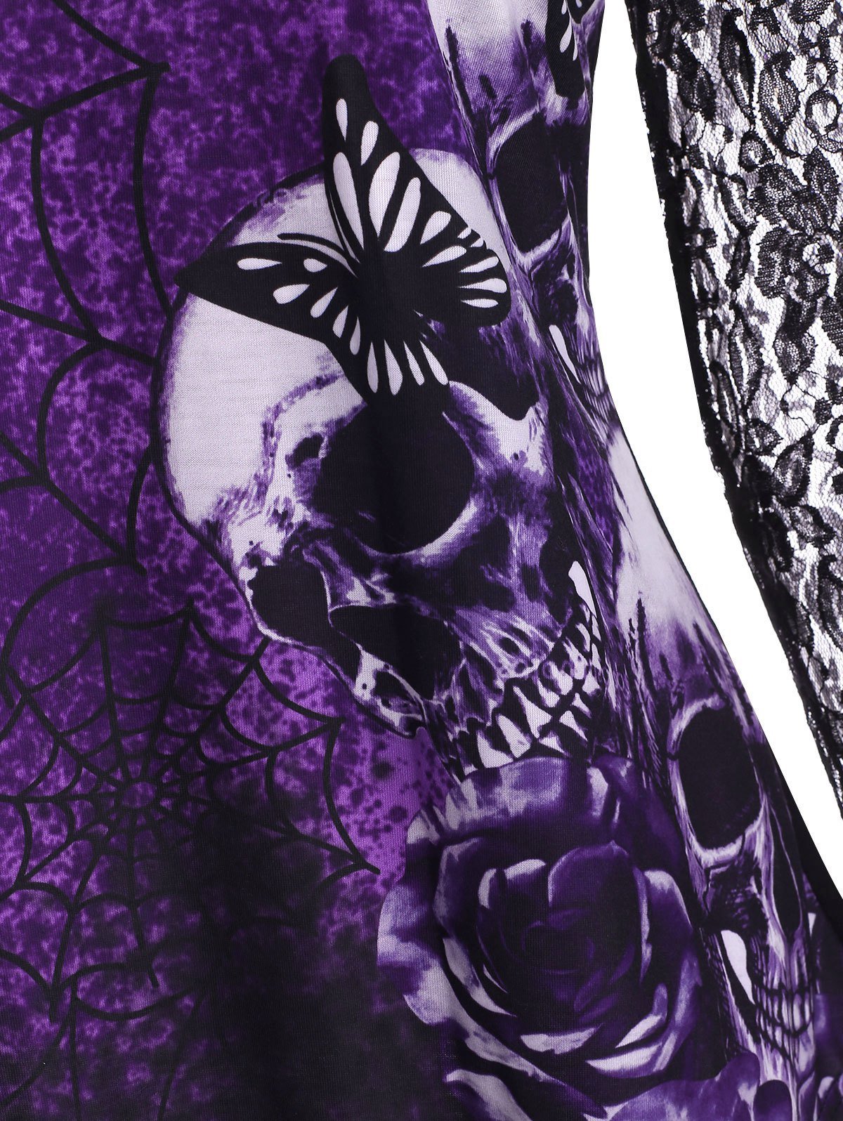 This curved hem tee is perfect for your Halloween night! Printed with spider web, skulls, butterfly and flower, it adorns with a sheer lace yoke and sleeves to show a bit of feminine vibe. Crisscross straps decorate the V-neck for a more inviting look.