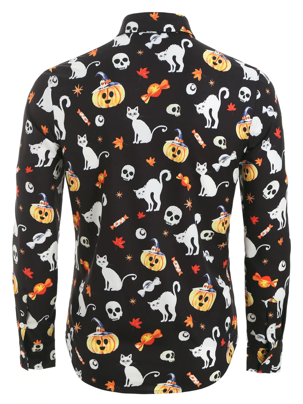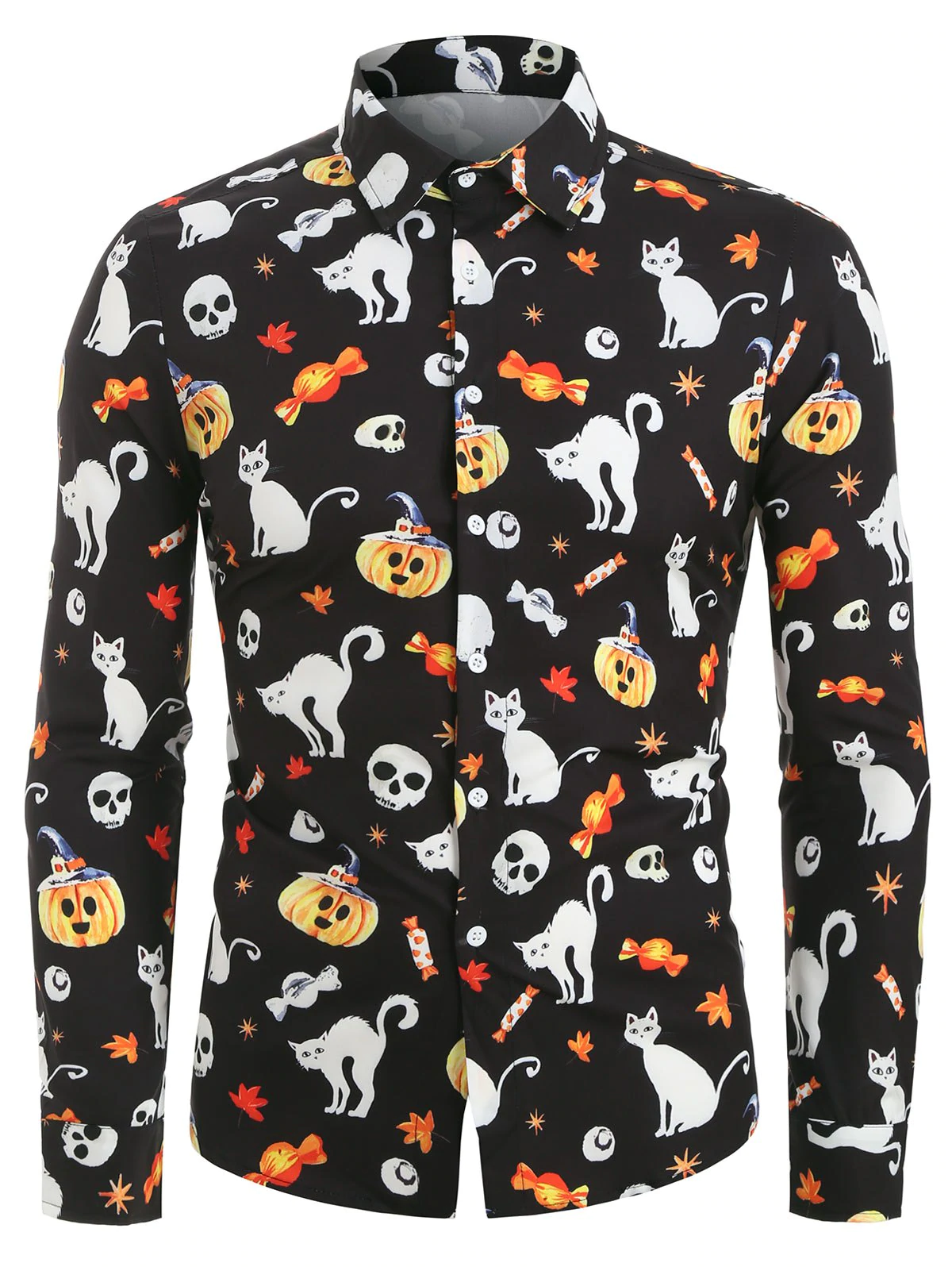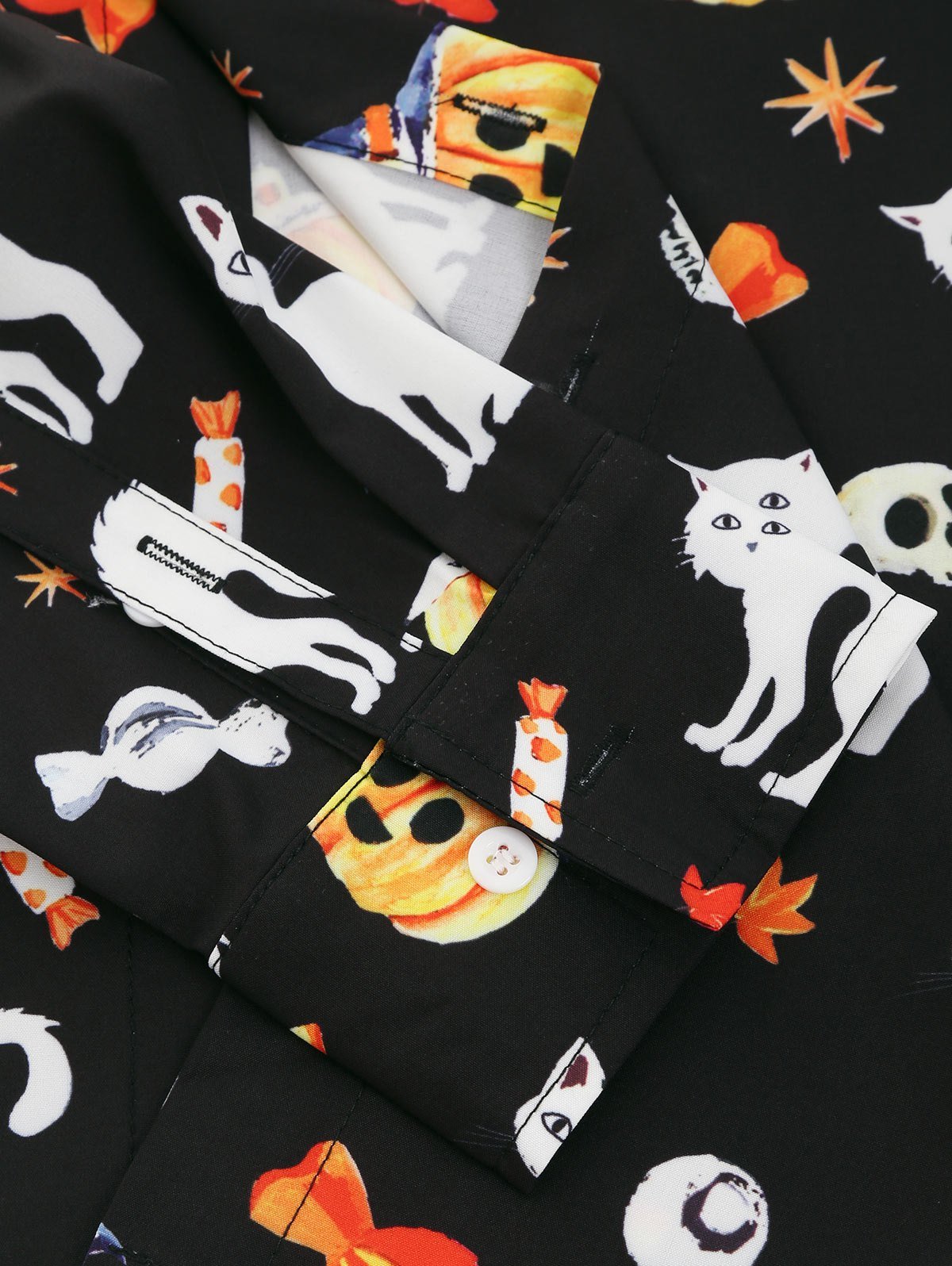 Halloween Pumpkin and Cat Print Button Up Long Sleeve Shirt