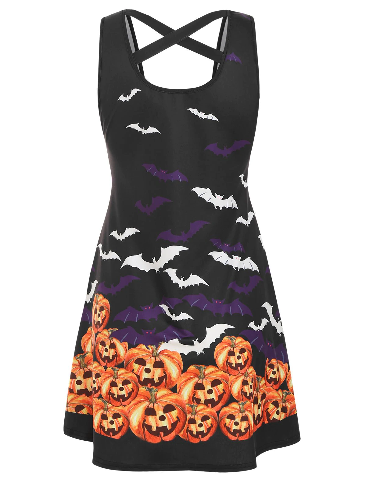Enjoy athletic and casual style with Halloween theme by wearing this pumpkin print dress. Crisscross design at the back adds a decorative detail. Sleeveless cut reinforces the comfort that you're going to feel when you're moving around in this dress. And mini length combines with A-line silhouette provide you with plenty of air moving inside of the dress itself.