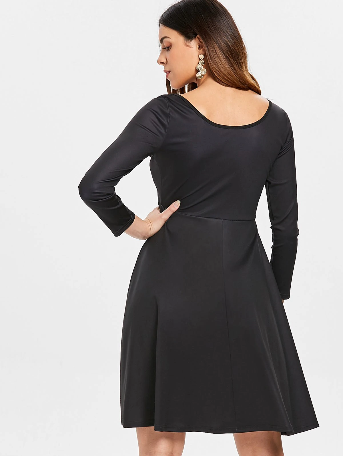 This casual 3/4 length sleeves dress features a low scoop neckline, contrasting pattern print, and a trendy fit-and-flare silhouette, in soft materials. The alluring knee-length adds charm and glamour, while the high waistline detail gives a modern feel.