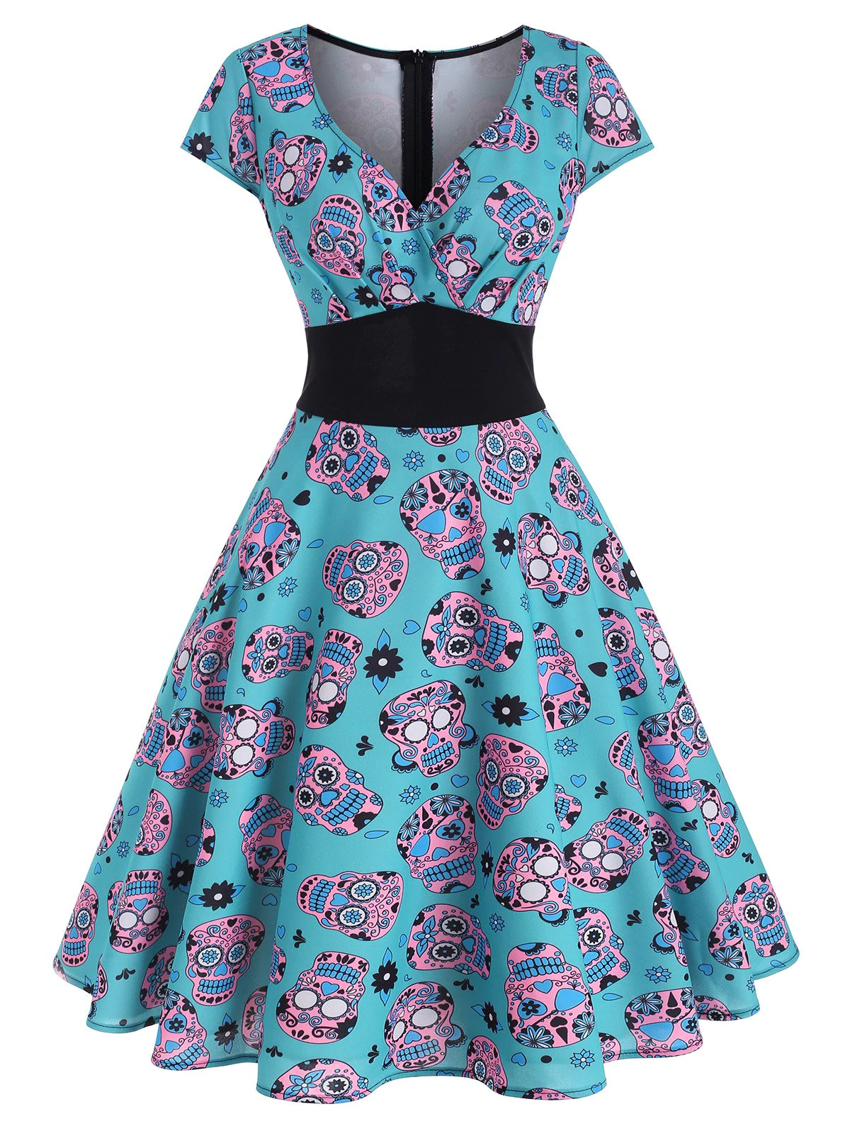 Printed with flower skulls that suit for the Halloween night, this dress adorns with a surplice plunging neck, adorable cap sleeves, and figure-flattering empire waist.