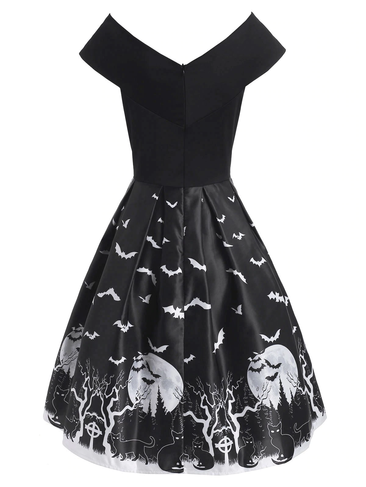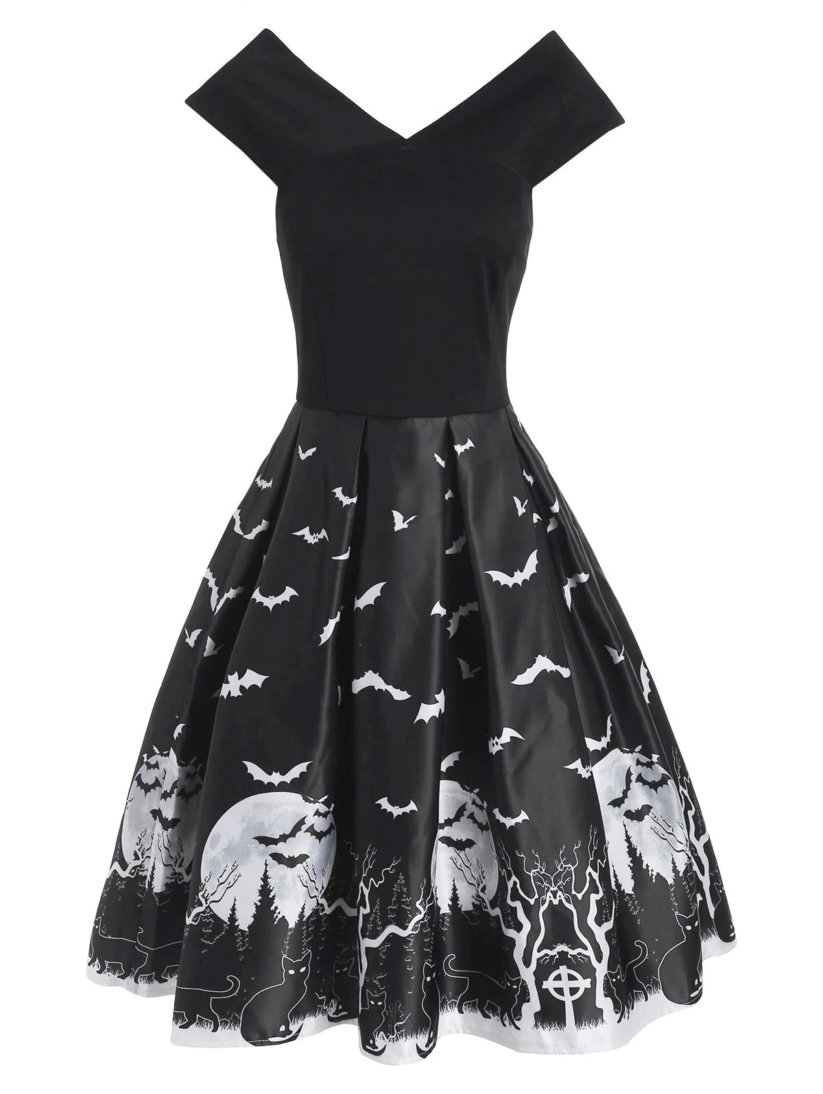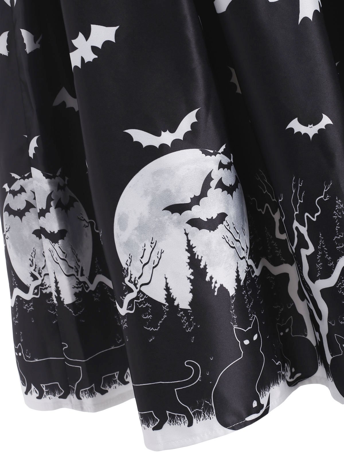 1 review for Halloween Tree Bat Moon Cat Print V Neck Dress