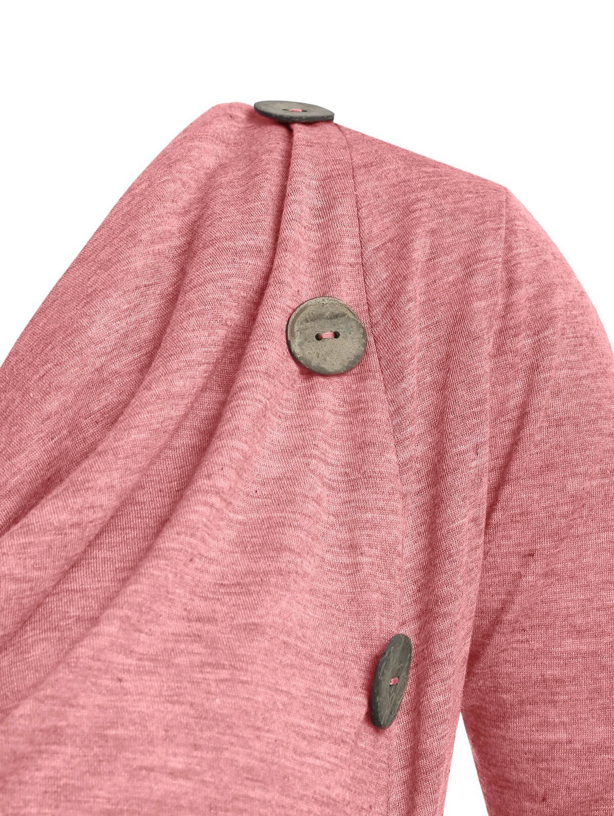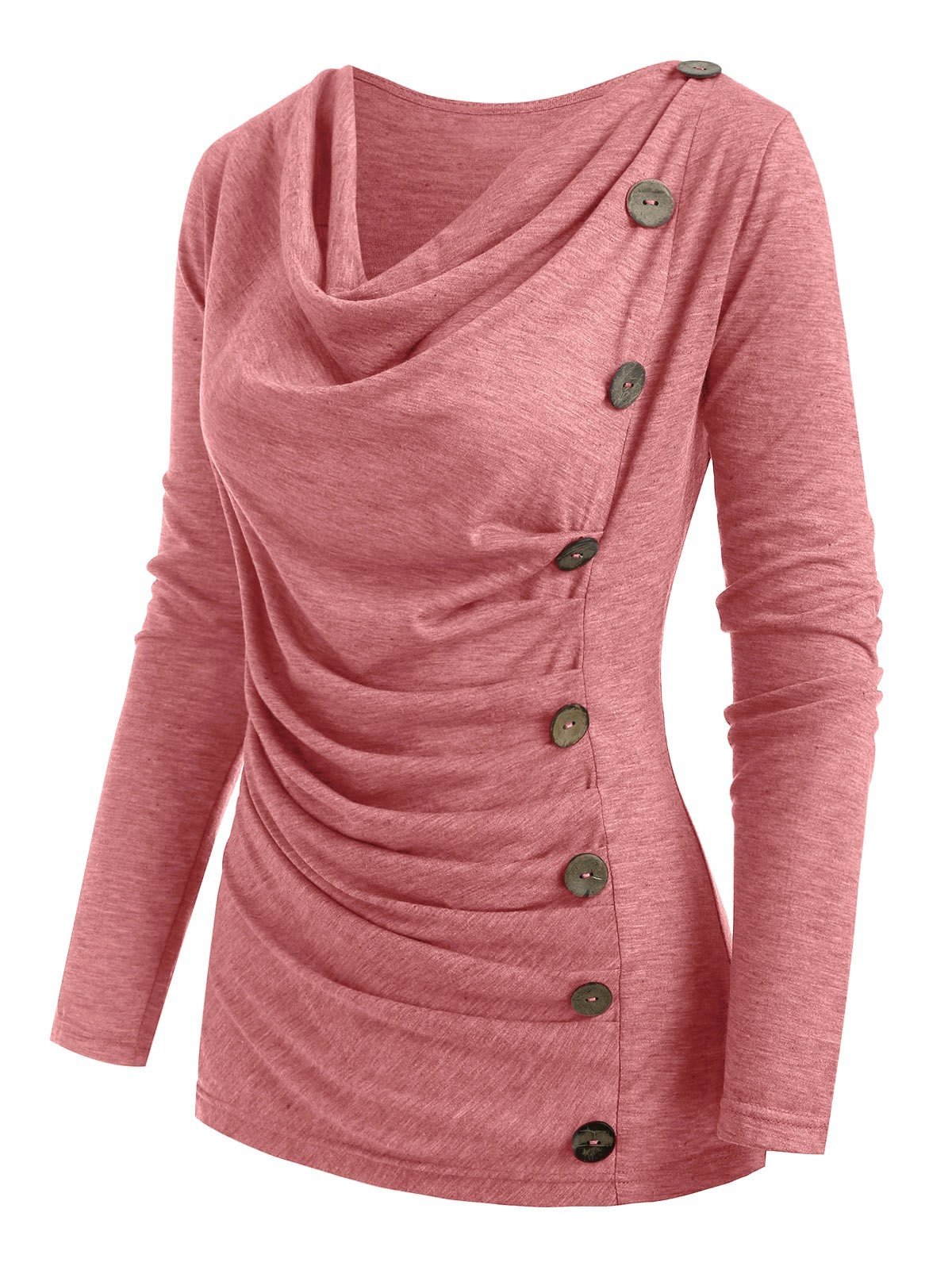 This long sleeve top is one of those not always be a stereotyped classic. It adorns with a cowl neckline with a ruched front to add a chic vibe. And buttons decorate at the sides create a wrap illusion.