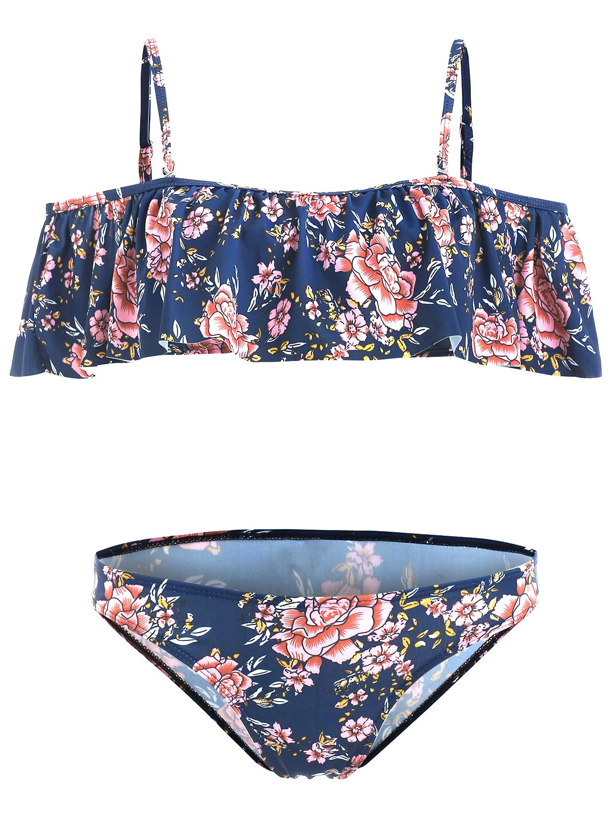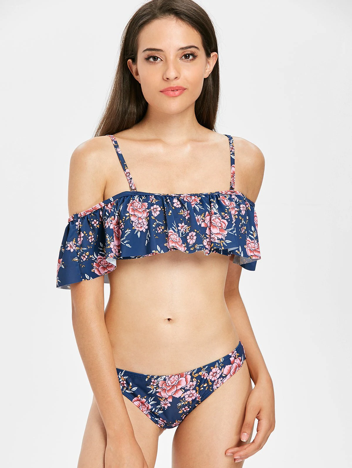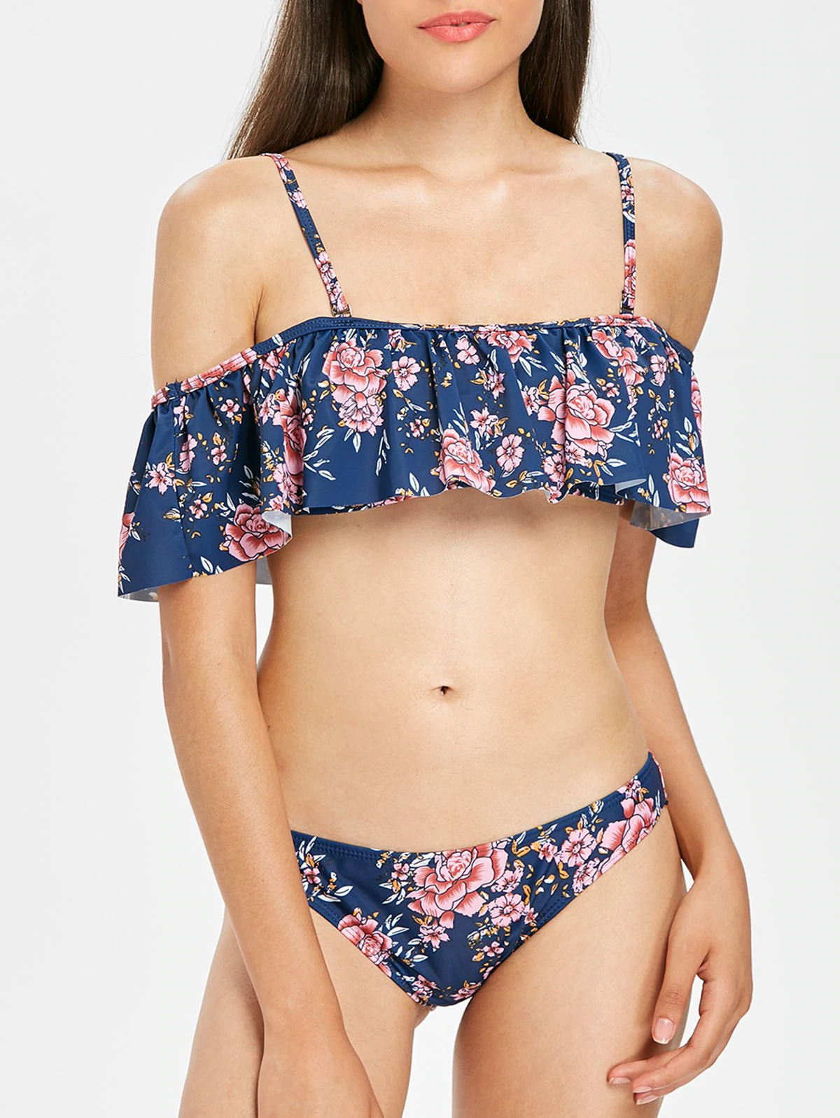 s boho-chic bikini features a widely ruffled top with an off the shoulder, elastic edge that fits easily around your arms. With removable adjustable straps for multiway wearing. The narrow hemline is finished with a serger which keeps the shape feminine and soft. The top has a built-in bra without underwires, so it is comfortable and will support you bust line easily. The sexy low rise bikini panty has a high leg cut style with elastic trim for easy stretch and great fit.