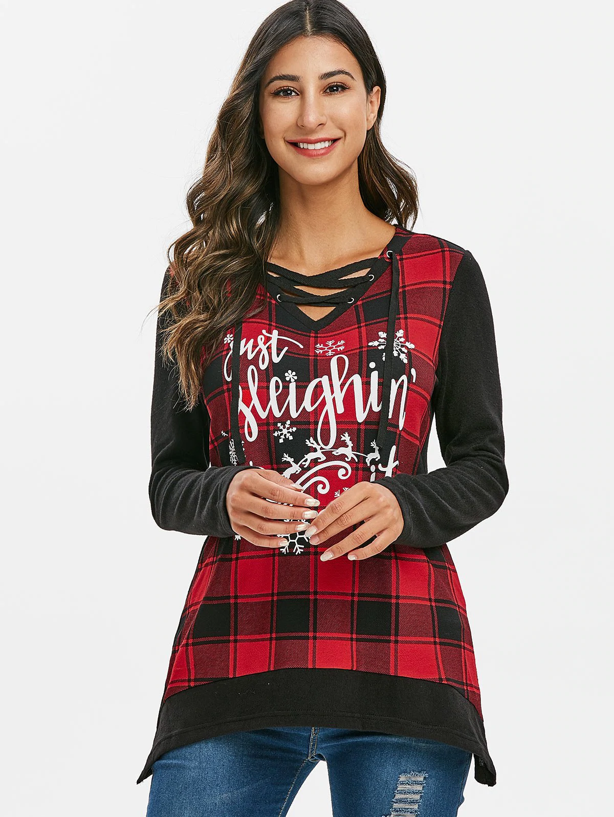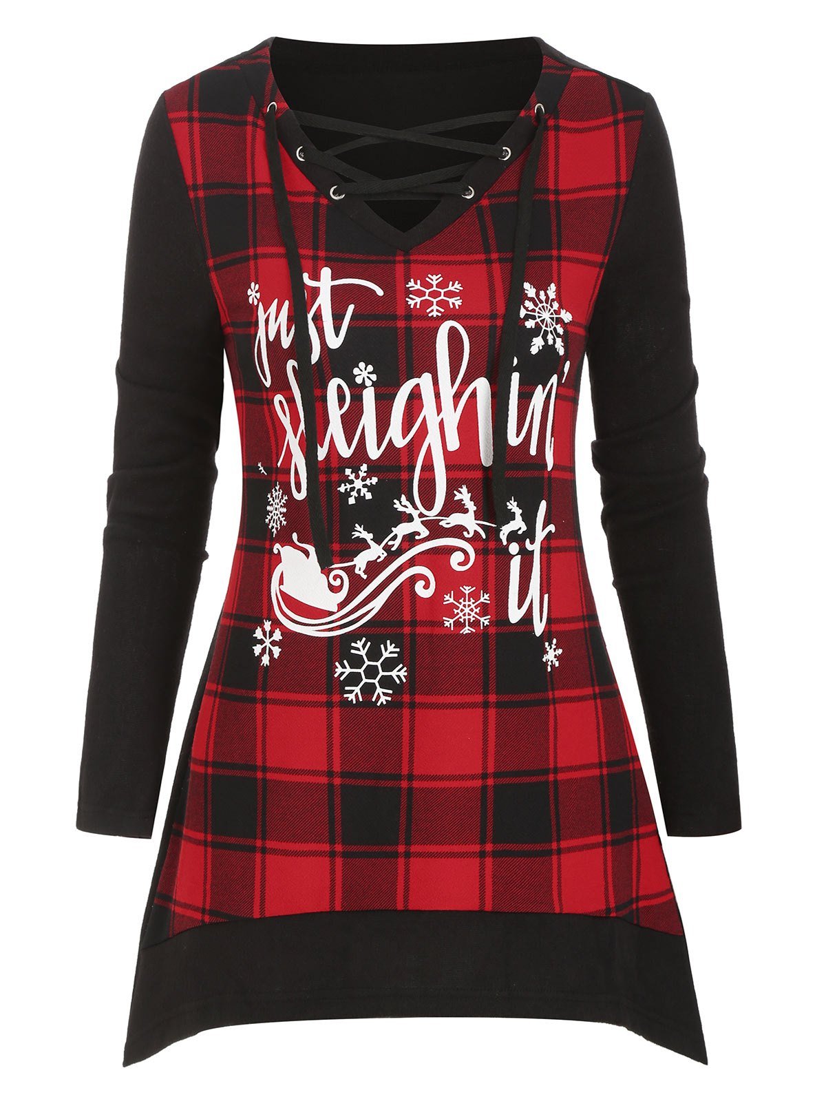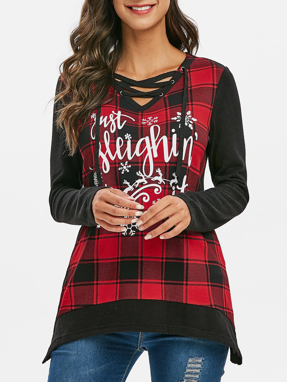 hristmas Elk Plaid Lace Up Asymmetrical Knitwear