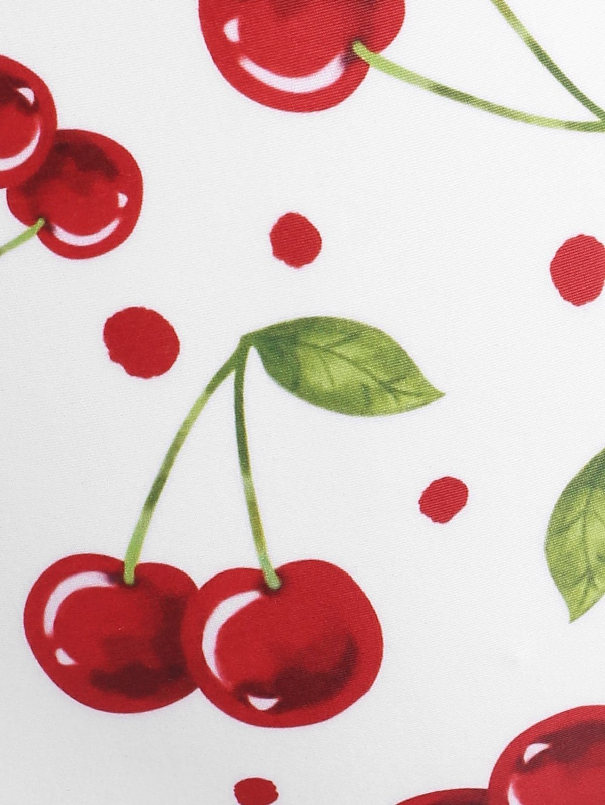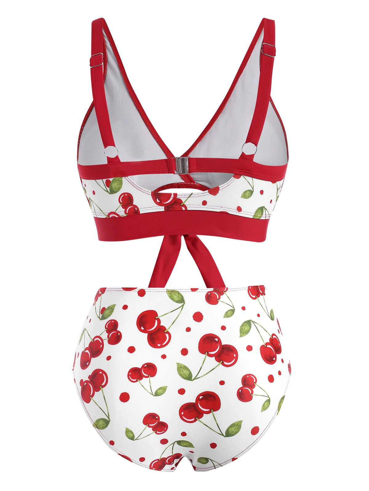 Covered in a sweet cherry pattern, the two-piece comprises a pair of high-rise briefs and a coordinating crop top with a surplice V-neckline and cutout knot detail on the front for maximum tanning potential.