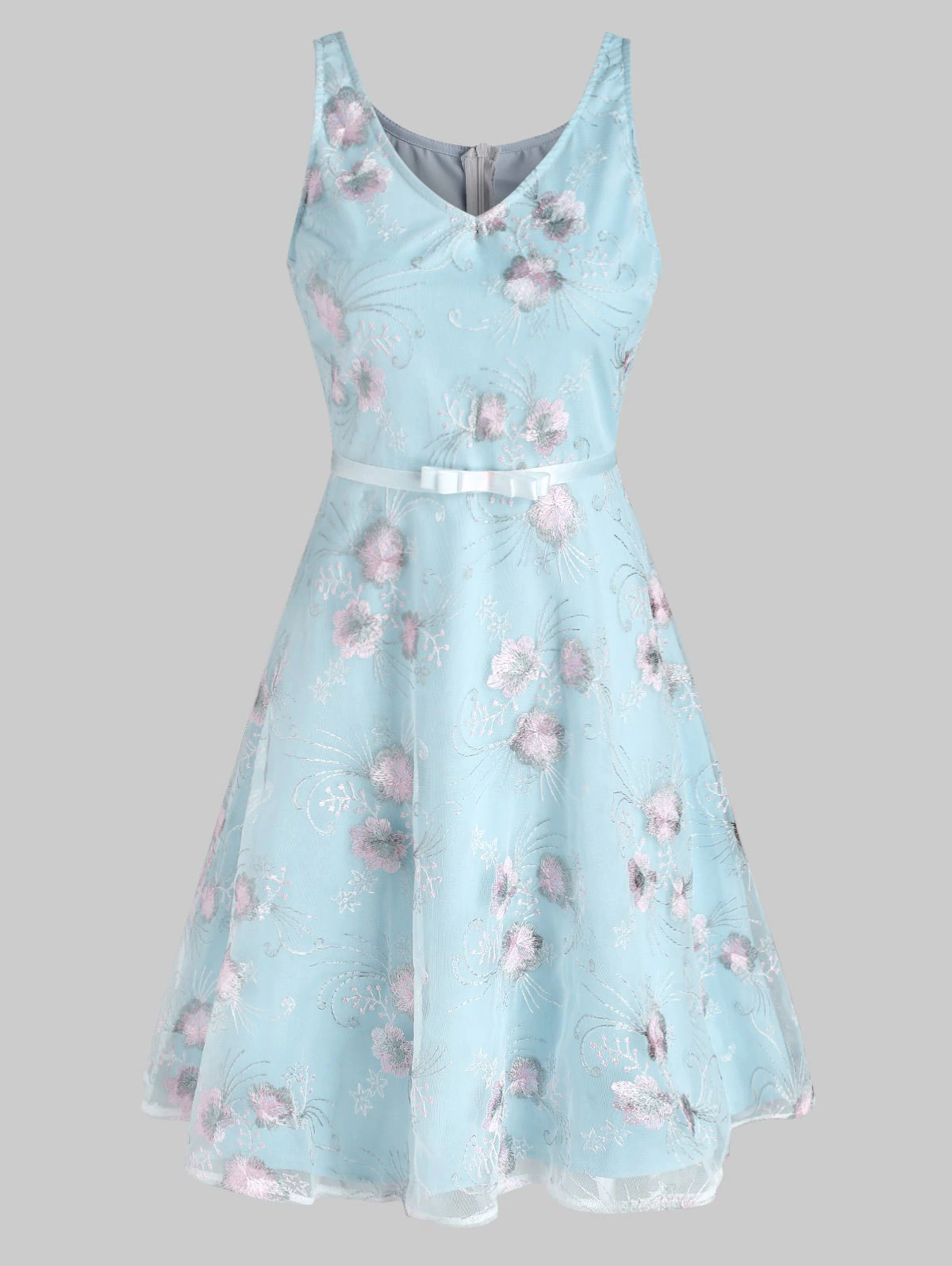 2 reviews for Lace Flower Embroidery Ribbon Belted A Line Dress