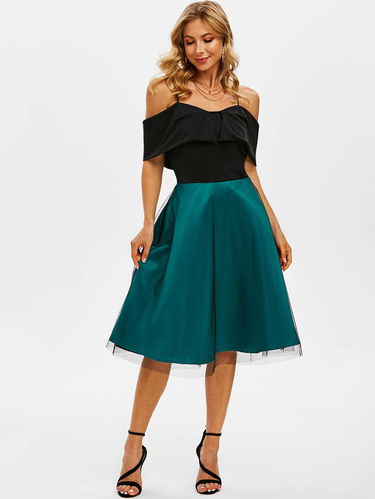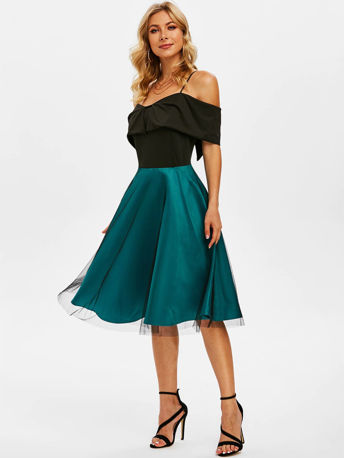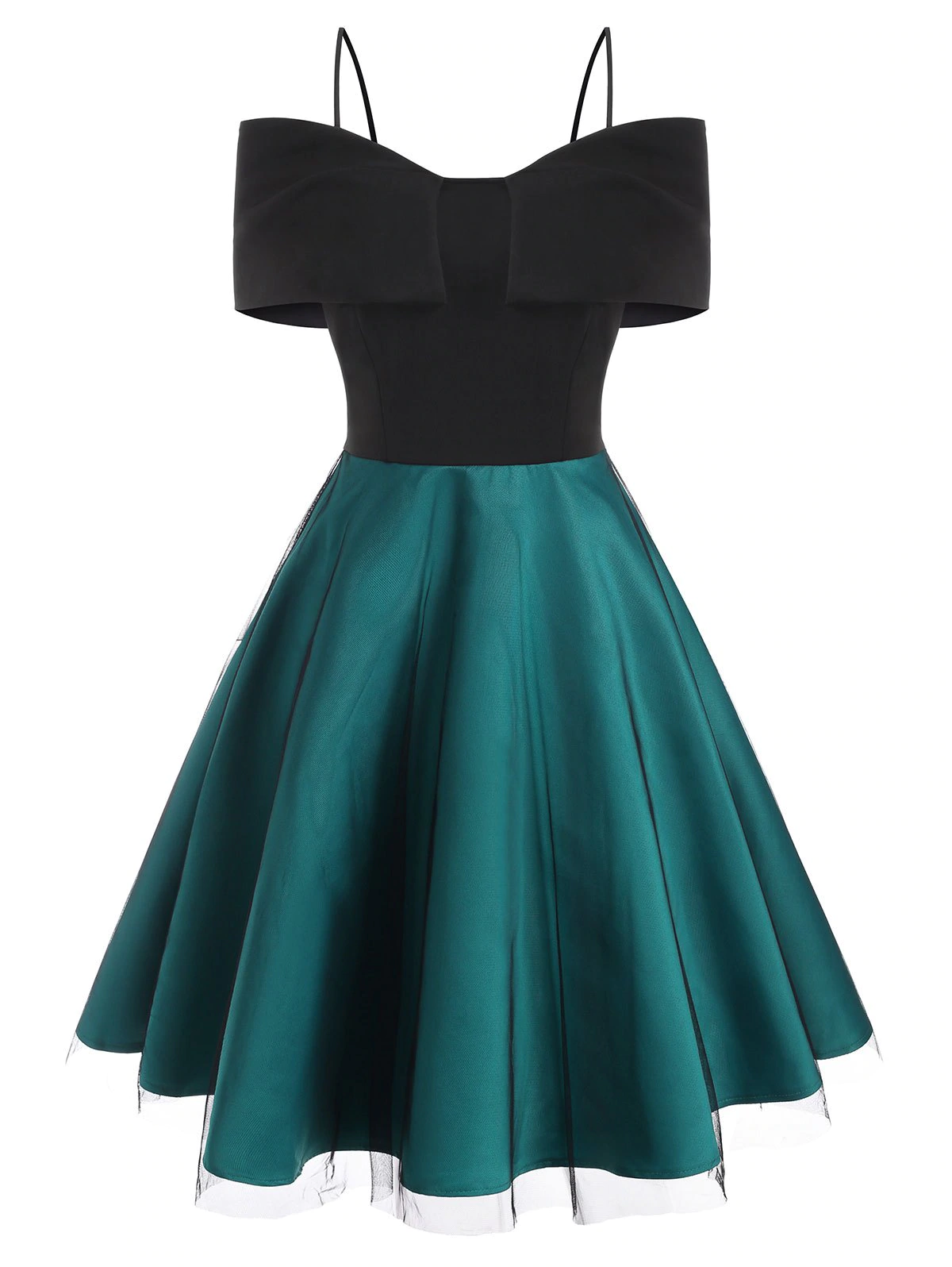 Show your elegance in the party by wearing this two-tone dress! Its foldover design echoes well with the cami straps to create alluring open shoulders. And the lace overlay gives a feminine vibe.
