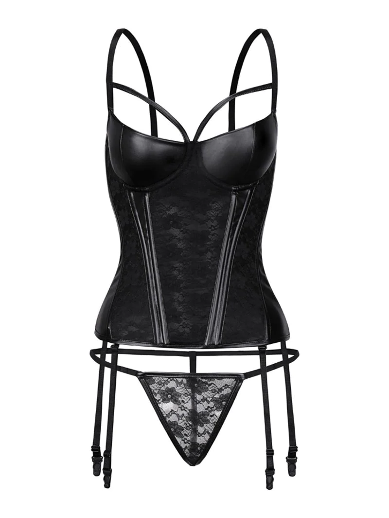 Lace Panel Faux Leather Underwire Bustier Corset Set