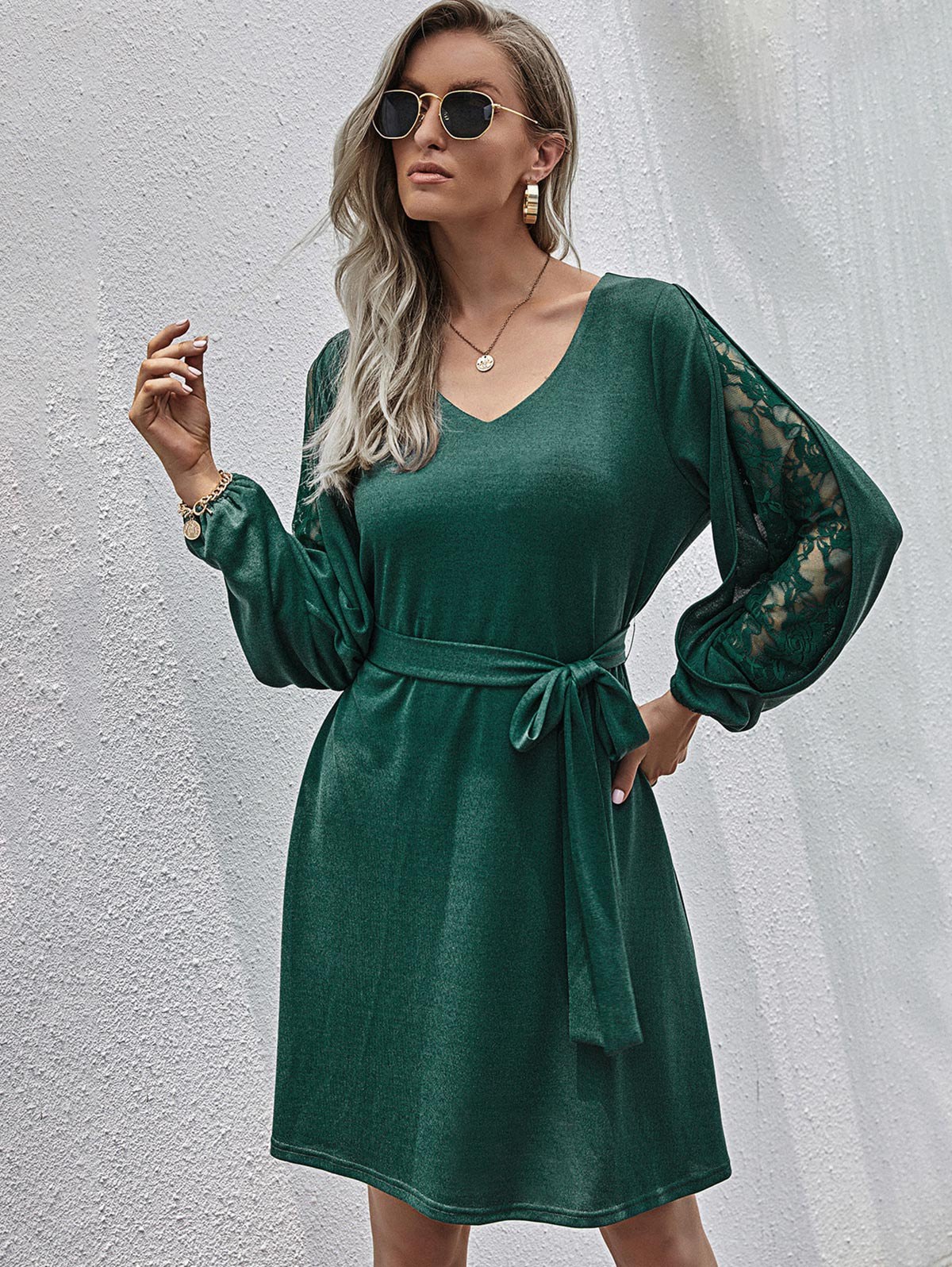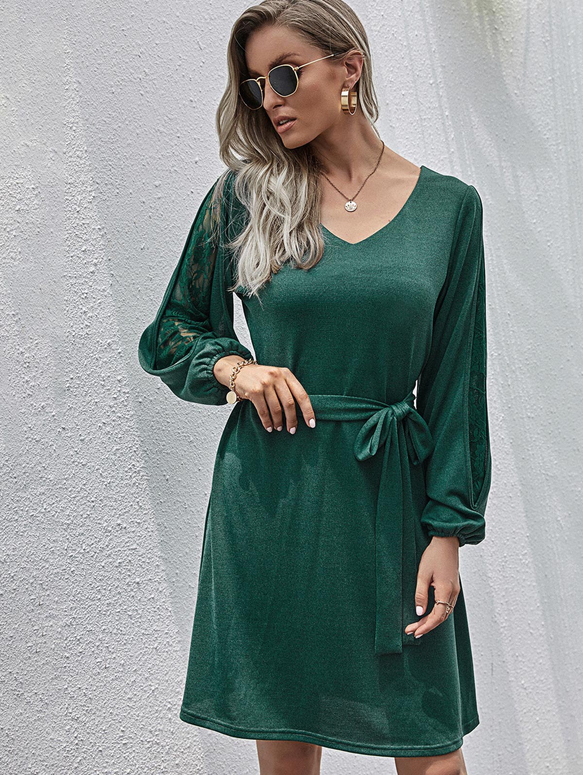 Lace Panel Split Sleeve Belted Knit Dress