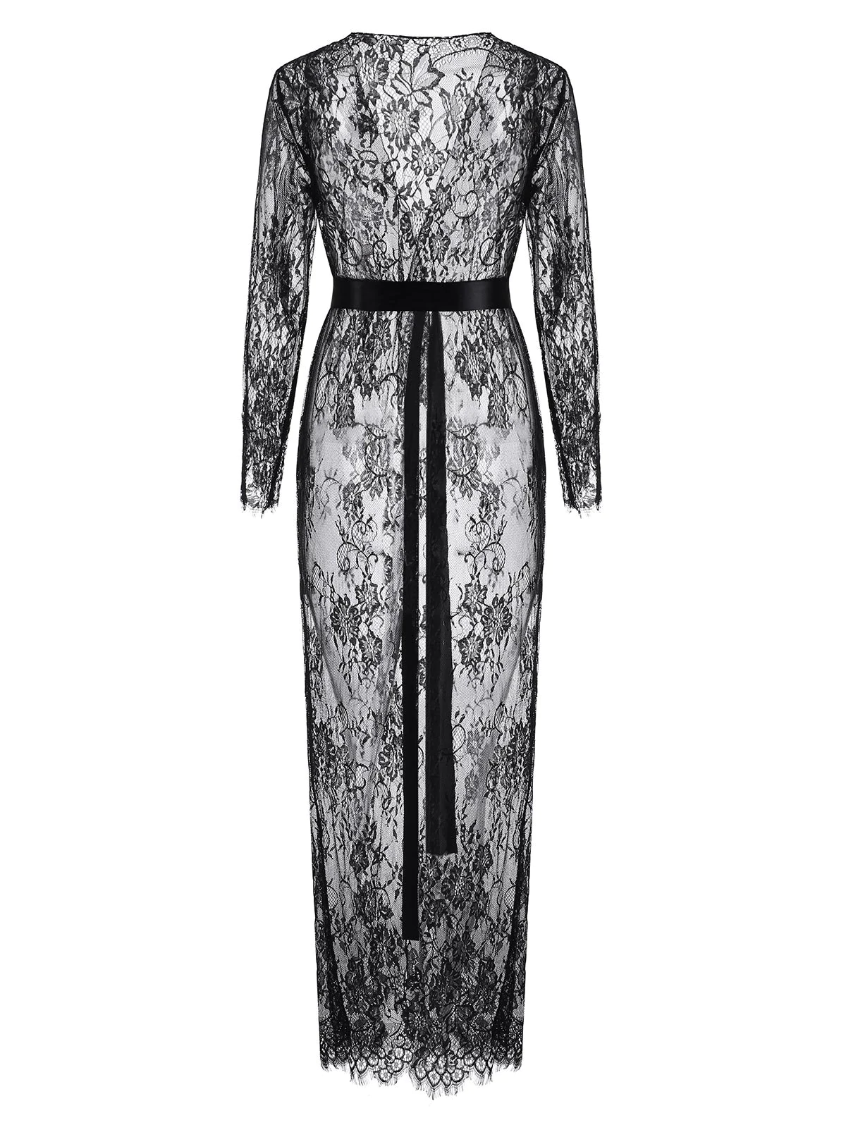 Lace Sheer Belted Long Lingerie Wrap Robe