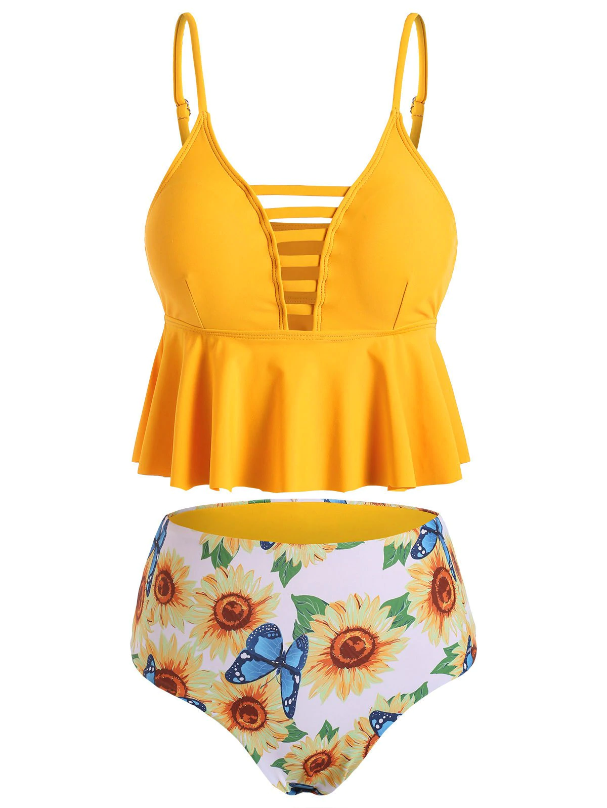 Ladder Cutout Sunflower Butterfly Peplum Tankini Set